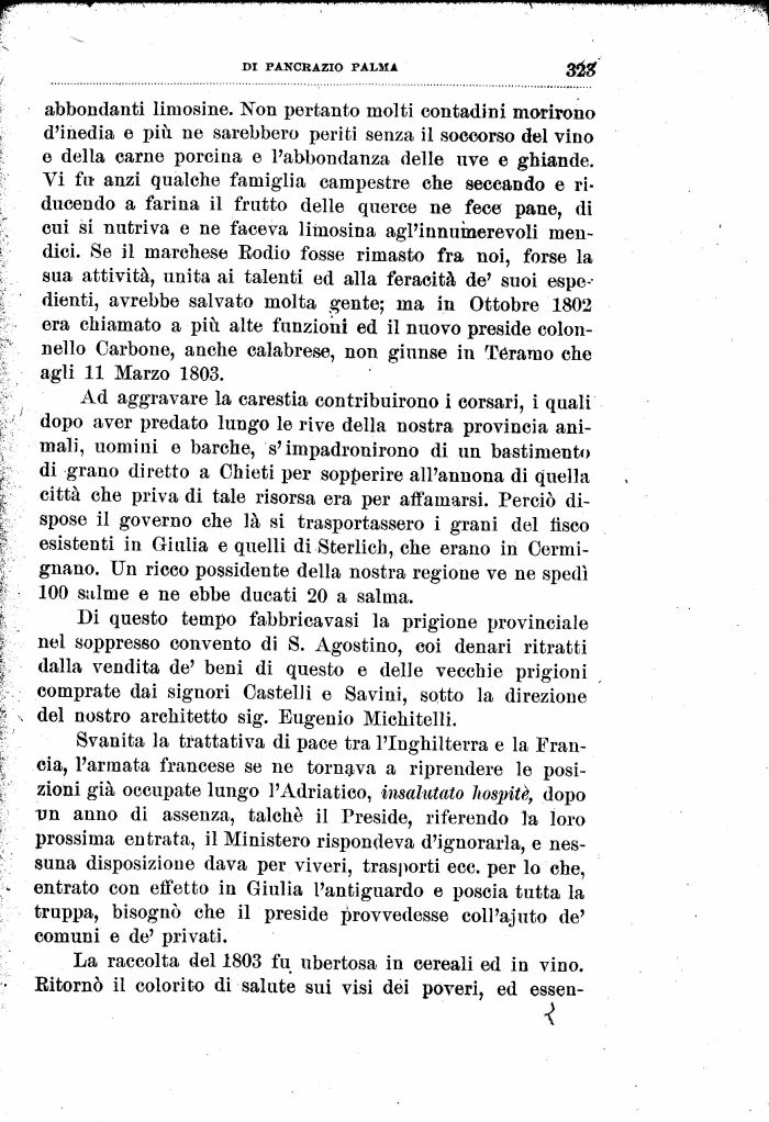 abbondanti limosino. Non pertanto molti contadini morirono d'inedia e più ne sarebbero periti senza il soccorso del vino e della carne porcina e l'abbondanza delle uve e ghiande. Vi fu anzi qualche famiglia campestre che seccando e riducendo a farina il frutto delle querce ne fece pane, di cui si nutriva e ne faceva limosina agl'innumerevoli men-dici. Se il marchese Eodio fosse rimasto fra noi, forse la sua attività, unita ai talenti ed alla feracità de' suoi espe--dienti, avrebbe salvato molta gente; ina in Ottobre 1802 era chiamato a più alte funzioni ed il nuovo preside colonnello Carbone, anche calabrese, non giunse in Térarao che agli 11 Marzo 1803.