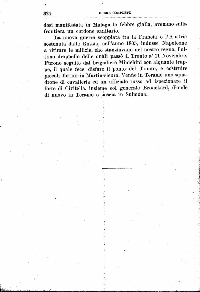 La nuova guerra scoppiata tra la Francia e l'Austria sostenuta dalla Eussia, nell'anno 1805, indusse Napoleone a ritirare le milizie, che. stanziavano nel nostro regno, l'ultimo drappello delle quali passò il Tronto a' 11 Novembre. Furono seguite dal brigadiere Minichini con alquante truppe, il quale fece disfare il ponte- del Tronto, e costruire pìccoli fortini in Martin-sicuro. Venne in Teramo uno squadrone di cavalleria ed u,n ufflziale russo ad ispezionare il forte di Civitella, insieme col generale Brouckard, d'onde di nuovo in Teramo e poscia in Sulmona.