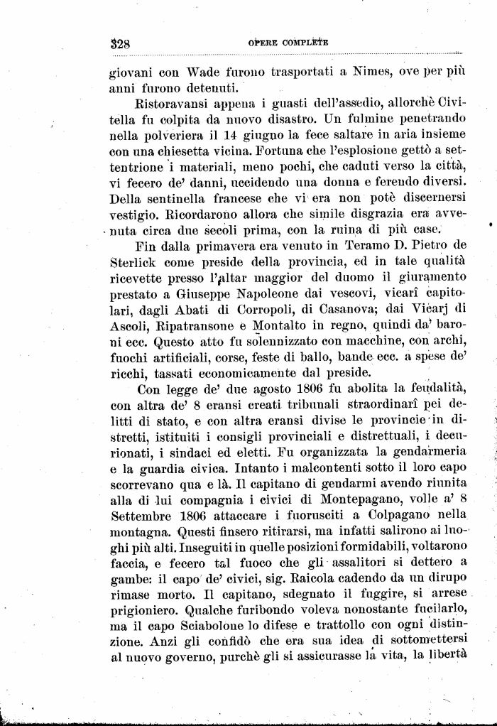 Fin dalla primavera era venuto in Teramo D. Pietro de Sterlick come preside della provincia, ed in tale qualità ricevette presso l'aitar maggior del duomo il giuramento prestato a Giuseppe Napoleone dai vescovi, vicarì capitolari, dagli Abati di Oorropoli, di Casanova; dai Vióarj di Ascoli, Ripatransone e Montalto in regno, quindi da' baroni ecc. Questo atto fu solennizzato con macchine, con archi, fuochi artificiali, corse, feste di ballo, bande ecc. a spese de' ricchi, tassati economicamente dal preside.