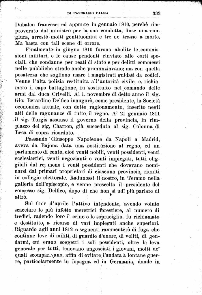 Finalmente in giugno 1810 furono abolite le commissioni militari, e le cause pendenti rinviate .alle corti speciali, che condanne per reati di stato e per delitti commessi nelle pubbliche strade anche pronunziavano; ma con quella posatezza che sogliono usare i magistrati guidati da codici. Venne l'alta polizia restituita all'autorità civile; e, richiamato il capo battaglione, fu sostituito nel comando delle armi dal duca Crivelli. Al 1. novembre di detto anno il 'sig. Gio: Berardino Delfico inaugurò, come presidente, la Società economica attuale, con dotto ragionamento, inserito negli atti delle ragunanze di tutto il regno. A' 21 gennaio 1811 il sig. Turgis assunse il governo della provincia, in rimpiazzo del sig. Oharron, già succeduto al sig. Colonna di Leca di sopra ricordato.