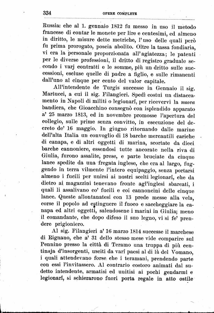 All'intendente de Turgis successe in Gennaio il sig. Martucci, a cui il sig. Pilangieri. Spedì costui un distaccamento in Napoli di militi o legionarì, per ricevervi la nuova bandiera, che Gioacchino consegnò con isplendido apparato a' 25 marzo 1813, ed in novembre promosse l'apertura del collegio, sulle prime senza convitto, in esecuzione del decreto de' 16 maggio. In giugno ritornando dalle marine dell'alta Italia un convoglio di 18 barche mercantili cariche di canapa, e di altri oggetti di marina, scortate da dieci barche cannoniere, essendosi tutte ancorate nella riva di Giulia, furono assalite, prese, e parte bruciate da cinque lance spedite da una fregata inglese, che era al largo, fuggendo in terra vilmente l'intero equipaggio, senza portarsi almeno i fucili per unirsi ai nostri scelti legionarì, che da dietro ai magazzini tenevano fronte agl'inglesi sbarcati, i quali li assalivano co' fucili e coi cannoncini delle cinque lance. Queste allontanatesi con 13 prede messe alla vela, corse il popolo ad estinguere il fuoco e saccheggiare la canapa ed altri oggetti, salendosene i marini in Giulia; meno il comandante, che dopo difeso il suo legno, vi si fé' prendere prigioniero.