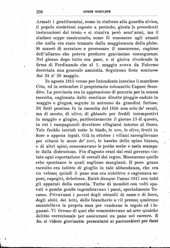 In agosto 1815 venne per Intendente interino il marchese Cito, ed in settembre il proprietario colonnello Oapece Scondito. La provincia era in apprensione di penuria per la scarsa raccolta, cagionata dalle continue dirotte pioggie cadute in maggio e giugno, seguite in autunno da grandini furiose. Di fatti pessima fu la raccolta del 1816 non solo de' cerali, ma di mosto, di ulive, di ghiande per freddi intempestivi in maggio e giugno, particolarmente il giorno 13 di questo, in cui i campagnuoli dovettero rifugiarsi intorno al fuoco. Tale freddo intristì tutte le biade, le uve, le olive, frutti in fiore o appena legati. Già in ottobre i villani raccoglievano per cibarsi le more de' rovi, le bacche dello spino bianco, e di altri spini; consumavano le poche sorbe e mela scampate dalla distruzione. Fin d'agosto erasi dal real governo vietata ogni esportazione di cereali dal regno. Mancarono quelle erbe spontanee le quali sogliono mangiarsi. Il poco grano raccolto era infetto di gioglio in tale abbondanza, che era un veleno; quindi il pane non era nutritivo e cagionava sopore, capogiri, debolezza. Entrò dunque l'anno 1817 con tutti gli apparati della carestia. Turbe di mendici con volti sparuti e gambe gonfie ingombravano i paesi, specialmente Te-ramo. Privavansi i poveri degli utensili di rame e di ferro, degli abiti, dei letti, delle biancherie a vii prezzo; qualcuno smantellava la pròpria casa per venderne le tegole ed i legnami. Yi furono di quei che commettevano ad arte qualche delitto correzionale per assicurarsi un pane nel carcere. E fin si videro giovinette presentarsi ai parrucchieri per farsi
