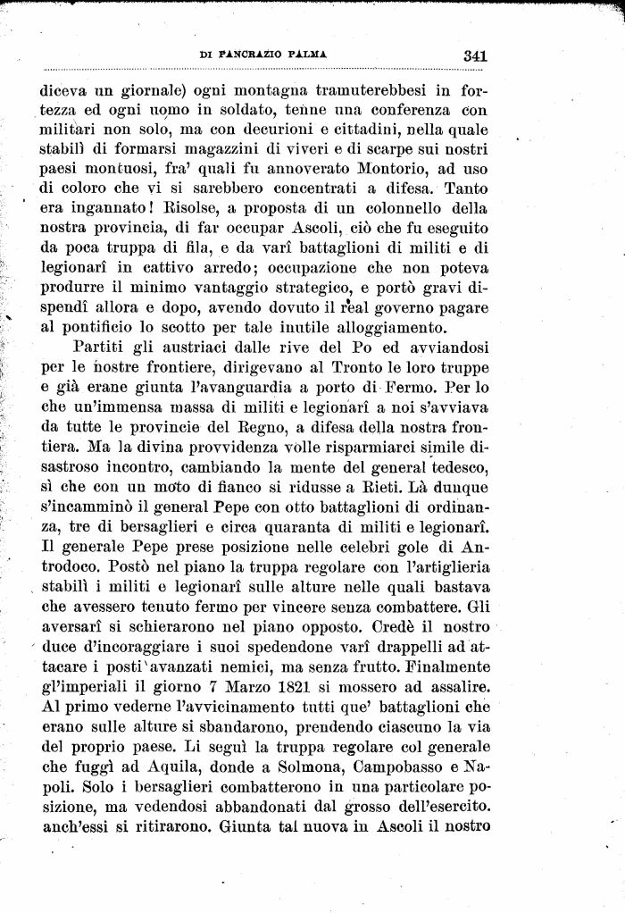 Partiti gli austriaci dalle rive del Po ed avviandosi per le nostre frontiere, dirigevano al Tronto le loro truppe e già erane giunta l'avanguardia a porto di Fermo. Per lo che un'immensa massa di militi e legionarì a noi s'avviava da tutte le provinole del Eegno, a difesa della nostra frontiera. Ma la divina provvidenza volle risparmiarci simile di-sastroso incontro, cambiando la mente del generai tedesco, sì che con un moto di fianco si ridusse a Eieti. Là dunque s'incamminò il generai Pepe con otto battaglioni di ordinanza, tre di bersaglieri e circa quaranta di militi e legionarì. Il generale Pepe prese posizione nelle celebri gole di An-trodoco. Postò nel piano la truppa regolare con l'artiglieria stabilì i militi e legionarì sulle alture nelle quali bastava che avessero tenuto fermo per vincere senza combattere. Gli aversarì si schierarono nel piano opposto. Credè il nostro duce d'incoraggiare i suoi spedendone vari drappelli ad at-tacare i posti'avanzati nemici, ma senza frutto. Finalmente gl'imperiali il giorno 7 Marzo 1821 si mossero ad assalire. Al primo vederne l'avvicinamento tutti que' battaglioni che erano sulle alture si sbandarono, prendendo ciascuno la via del proprio paese. Li seguì la truppa regolare col generale che fuggì ad Aquila, donde a Solmona, Oampobasso e Napoli. Solo i bersaglieri combatterono in una particolare posizione, ma vedendosi abbandonati dal grosso dell'esercito, anch'essi si ritirarono. Giunta tal nuova in Ascoli il nostro