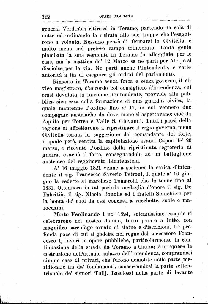 Eimasto in Teramo senza forza e senza governo, il civico magistrato, d'accordo col consigliere d'intendenza, cui erasi devoluta la funzione d'intendente, provvide alla pubblica sicurezza colla formazione di una guardia civica, la quale mantenne l'ordine fino a' 17, in cui vennero due compagnie austriache da dove meno si aspettavano: cioè da Aquila per Tottea e Valle 8. Giovanni. Tutti i paesi della regione si affrettarono a ripristinare il regio governo, meno Civitella tenuta in soggezione dal comandante del forte, il quale però, sentita la capitolazione avanti Oapua de' 20 marzo, e ricevuto l'ordine della ripristinata segreteria di guerra, evacuò il forte, consegnandolo ad un battaglione austriaco del reggimento Lichtenstein.