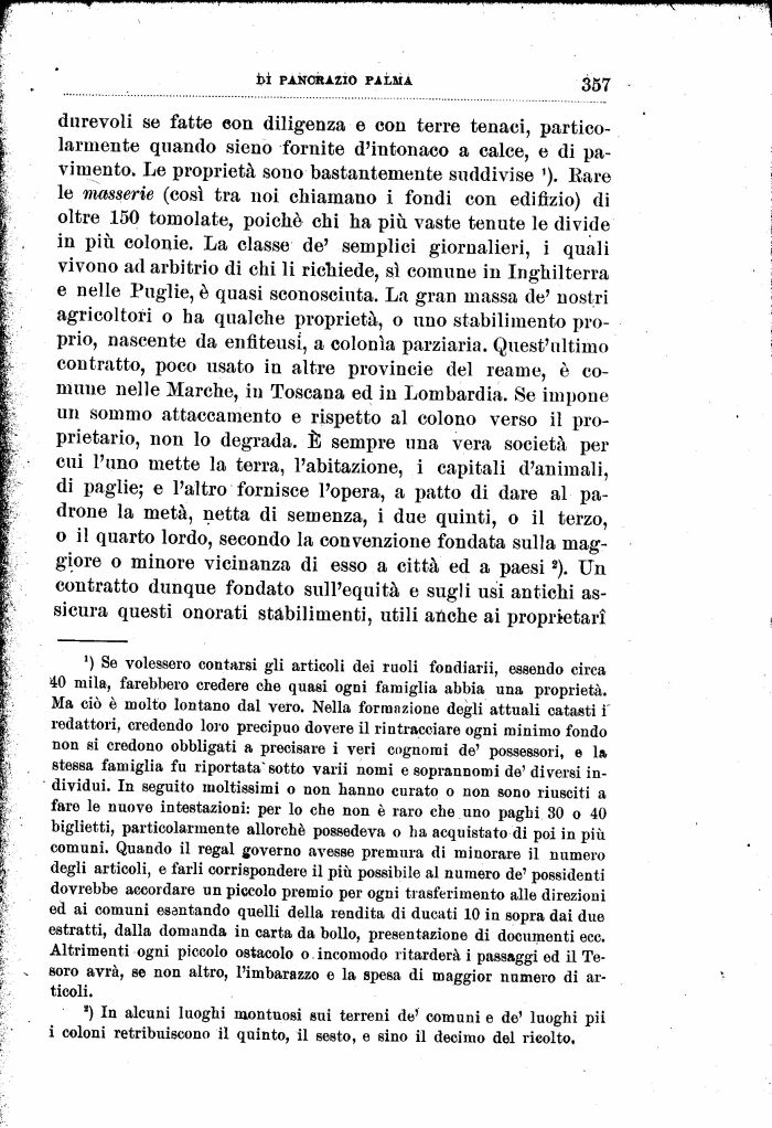 durevoli se fatte eon diligenza e con terre tenaci, particolarmente quando sieno fornite d'intonaco a calce, e di pavimento. Le proprietà sono bastantemente suddivise '). Rare le masserie (così tra noi chiamano i fondi con edilìzio) di oltre 150 tomolate, poiché chi ha più. vaste tenute le divide in più colonie. La classe de' semplici giornalieri, i quali vivono ad arbitrio di chi li richiede, sì comune in Inghilterra e nelle Puglie, è quasi sconosciuta. La gran massa de' nostri agricoltori o ha qualche proprietà, o uno stabilimento proprio, nascente da enfiteusi, a colonia parziaria. Quest'ultimo contratto, poco usato in altre provincie del reame, è comune nelle Marche, in Toscana ed in Lombardia. Se impone un sommo attaccamento e rispetto al colono verso il proprietario, non lo degrada. È sempre una vera società per cui l'uno mette la terra, l'abitazione, i capitali d'animali, di paglie; e l'altro fornisce l'opera, a patto di dare al padrone la metà, netta di semenza, i due quinti, o il terzo, o il quarto lordo, secondo la convenzione fondata sulla maggiore o minore vicinanza di esso a città ed a paesi2). Un contratto dunque fondato sull'equità e sugli usi antichi assicura questi onorati stabilimenti, utili anche ai proprietarì