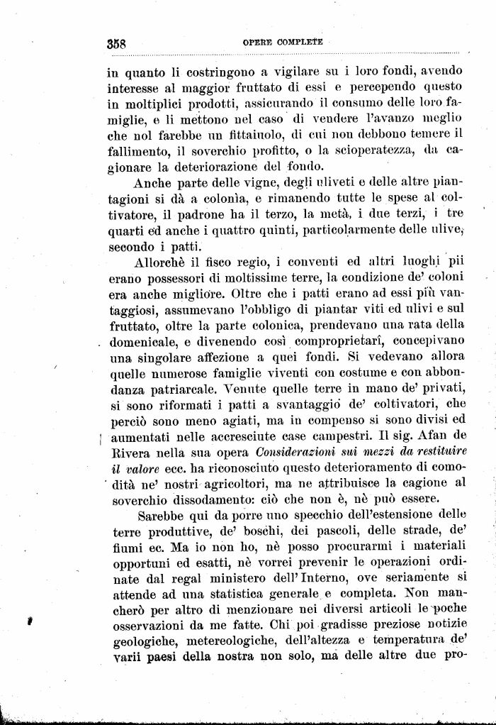 Allorché il fisco regio, i conventi ed altri luoghi pii erano possessori di moltissime terre, la condizione de' coloni era anche migliore. Oltre che i patti erano ad essi più vantaggiosi, assumevano l'obbligo di piantar viti ed ulivi e sul fruttato, oltre la parte colonica, prendevano una rata della domenicale, e divenendo così coinproprietari, concepivano una singolare affezione a quei fondi. Si vedevano allora quelle numerose famiglie viventi con costume e con abbondanza patriarcale. Venute quelle terre in mano de' privati, si sono riformati i patti a svantaggiò de' coltivatori, che perciò sono meno agiati, ma in compenso si sono divisi ed aumentati nelle accresciute case campestri. Il sJg. Afan de Eivera nella sua opera Considerazioni mi mezzi da restituire il valore ecc. ha riconosciuto questo deterioramento di comodità ne' nostri agricoltori, ma ne attribuisce la cagione al soverchio dissodamento: ciò che non è, né'può essere.