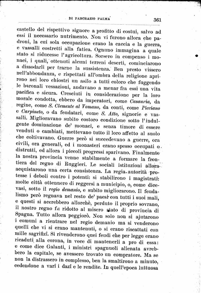 castello del rispettivo signore a profitto di costui, salvo ad essi il necessario nutrimento. Non vi furono allora che padroni, la cui sola occupazione erano la caccia e la guerra, e vassalli costretti alla fatica. Ognuno immagina a quale stato si riducesse l'agricoltura. Sorsero in compenso i monaci, i quali, ottenuti alcuni terreni deserti, cominciarono a dissodarli per trame la sussistenza. Ben presto vissero nell'abbondanza, e rispettati all'ombra della religione aprirono nei loro chiostri un asilo a tutti coloro che fuggendo le baronali vessazioni, andavano a menar fra essi una vita pacifica e sicura. Cresciuti in considerazione per la loro morale condotta, ebbero da imperatori, come Casauria, da regine, come /$. Clemente al Tornano, da conti, come Picciano e Carpineta, o da feudatari, come S. Atto, signorie e vassalli. Miglioravano subito costoro condizione sotto l'indulgente dominazione de' monaci, e senza timore di essere venduti o cambiati, mettevano tutto il loro affetto al suolo che coltivavano. Guerre però si succedevano a guèrre, ora civili, ora generali, ed i monasteri erano spesso occupati o.-distrutti, ed allora i piccoli progressi sparivano. Finalmente la nostra provincia venne stabilmente a formare la frontiera del regno di Euggieri. Le sociali istituzioni allora-acquistarono una certa consistenza. La regia, autorità protesse i deboli contro i potenti: si stabilirono i magistrati: molte città ottennero di reggersi a municipio, o, come dice-vasi, sotto il regio demanio, e subito migliorarono. Il feudalismo però regnava nel resto de' paesi-con tutti i suoi mali, e questi si accrebbero allorché, perduto il proprio sovrano, il nostro regno fu ridotto al mìsero sitato di provincia di Spagna. Tutto allora peggiorò. Non solo non si ajutarono i comuni a rientrare nel regio demanio ma si venderono quelli che vi si erano mantenuti, o si erano riscattati con mille sagrifizi. Si rivenderono quei feudi che per legge erano ricaduti alla corona, in vece di mantenerli a prò di essa: e come dice Galanti, i ministri spagnuoli alienata avrebbero la capitale, se avessero trovato un compratóre. Ma se non la distrassero in complesso, ben la smaltirono a minuto, cedendone a vari i dazi e le rendite. In quell'epoca luttuosa