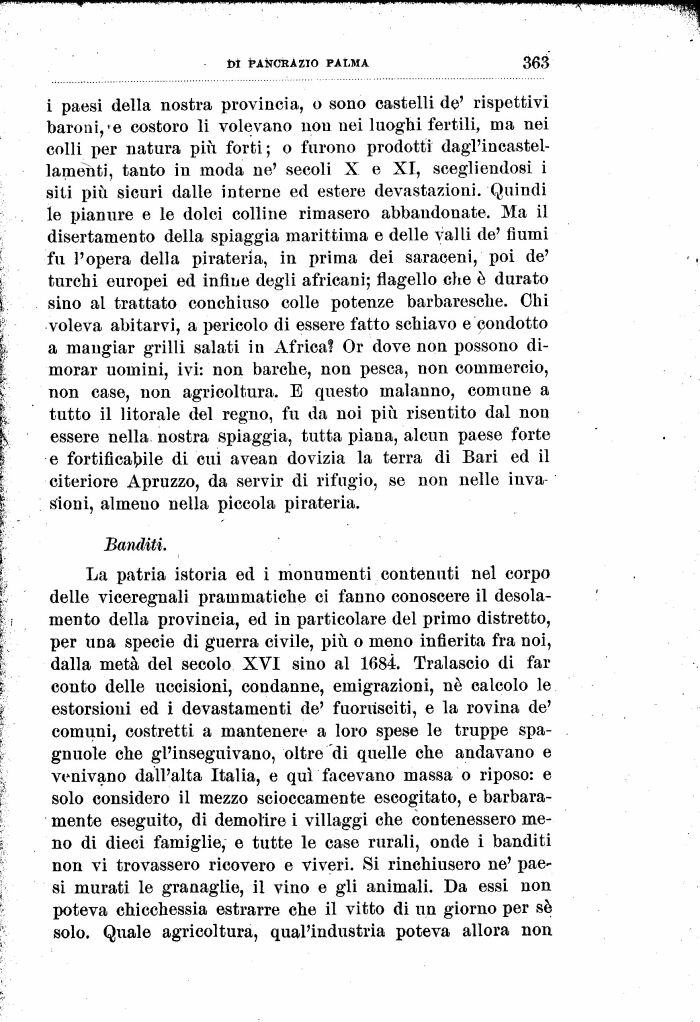 i paesi della nostra provincia, o sono castelli de' rispettivi baroni, »e costoro li volevano non nei luoghi fertili, ma nei colli per natura più forti; o furono prodotti dagl'incastellamenti, tanto in moda ne' secoli X e XI, scegliendosi i siti più sicuri dalle interne ed estere devastazioni. Quindi le pianure e le dolci colline rimasero abbandonate. Ma il disertamento della spiaggia marittima e delle valli de' fiumi fu l'opera della pirateria, in prima dei saraceni, poi de' turchi europei ed infine degli africani; flagello che è durato sino al trattato conchiuso colle potenze barbaresche. Ohi voleva abitarvi, a pericolo di essere fatto schiavo e condotto a mangiar grilli salati in Africa? Or dove non possono dimorar uomini, ivi: non barche, non pesca, non commercio, non case, non agricoltura. E questo malanno, comune a tutto il litorale del regno, fu da noi più risentito dal non essere nella nostra spiaggia, tutta piana, alcun paese forte e fortificabile di cui avean dovizia la terra di Bari ed il citeriore Apruzzo, da servir di rifugio, se non nelle invasioni, almeno nella piccola pirateria.