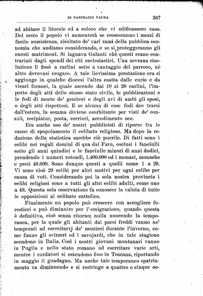 Era anche uso de' nostri pubblicisti di riporre fra le cause di spopolamento il celibato religioso. Ma dopo la redazione della statistica sarebbe ciò puerile. Di fatti sono i celibi nei regali domini di qua dal Faro, esclusi i fanciulli sotto gli anni quindici e le fanciulle minori di anni dodici, prendendo i numeri rotondi, 1.400.000 ed i monaci, monache e preti 48.000. Sono dunque questi a quelli come 1 a 29. Vi sono cioè 29 celibi per altri motivi per ogni celibe per causa di voti. Considerando poi la sola nostra provincia i celibi religiosi sono a tutti gli altri celibi adulti, come uno a 49. Questa sola osservazione fa conoscer la valuta di tutte le opposizioni al celibato cattolico.