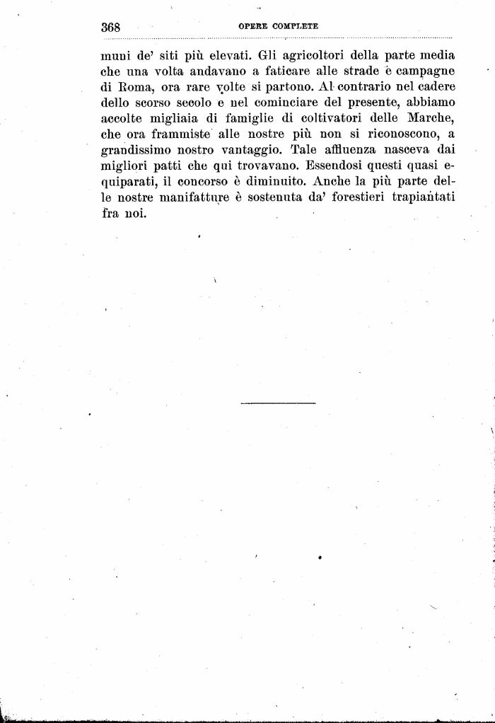 munì de' siti più elevati. Gli agricoltori della parte media che una volta andavano a faticare alle strade è campagne di Eoma, ora rare volte si partono. Al contrario nel cadere dello scorso secolo e nel cominciare del presente, abbiamo accolte migliaia di famiglie di coltivatori delle Marche, che ora frammiste alle nostre più non si riconoscono, a grandissimo nostro vantaggio. Tale affluenza nasceva dai migliori patti che qui trovavano. Essendosi questi quasi e-quiparati, il concorso è diminuito. Anche la più parte delle nostre manifatture è sostenuta da' forestieri trapiantati fra noi.