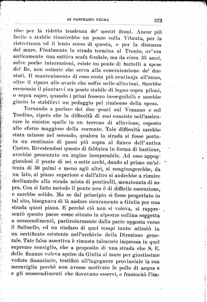 Tornando a parlare dei due 'ponti sul Vomano e sul Tordi no, ripeto che la difficoltà di essi consiste nell'assicu-rare le sinistre spalle in un terreno di alluvione, esposto allo sforzo maggiore della corrente. Tale difficoltà sarebbe stata minore nel secondo, qualora la strada si fosse portata un centinaio di passi più sopra al fianco dell'antica Castro. Rivestendosi questo di fabbrica in forma di bastione, avrebbe presentato un argine insuperabile. Ad esso appoggiandosi il ponte di sei o sette archi, dando al primo un'altezza di 30 palmi e meno agli altri, si congiungerebbe, da un lato, al piano superiore e dall'altro si andrebbe a riunire declinando alla strada mista di ponticelli, menzionata di sopra. Con sì fatto metodo il ponte non è di difficile esecuzione, e sarebbe solido. Ma se dal principio, si fosse progettato in tal sito, bisognava di là andare sicuramente a Giulia per una strada quasi piana. E perché ciò non si voleva, si rappresentò questo paese come situato in alpestre collina soggetta a scoscendimenti, particolarmente dalla parte opposta verso il Salinello, ed un sindaco di quei tempi tanto attestò in un certificato esistente nell'archivio della Direzione generale. Tale falsa assertiva è rimasta talmente impressa in quel supremo consiglio, che a proposito di una strada che 8. E. delle finanze voleva aprire da Giulia al mare per giustissime vedute finanziarie, testificò all'ingegnerò provinciale la sua meraviglia perché non avesse motivato le polle di acqua e e gli scoscendimenti che dovevano esservi, e frastornò l'ira.-