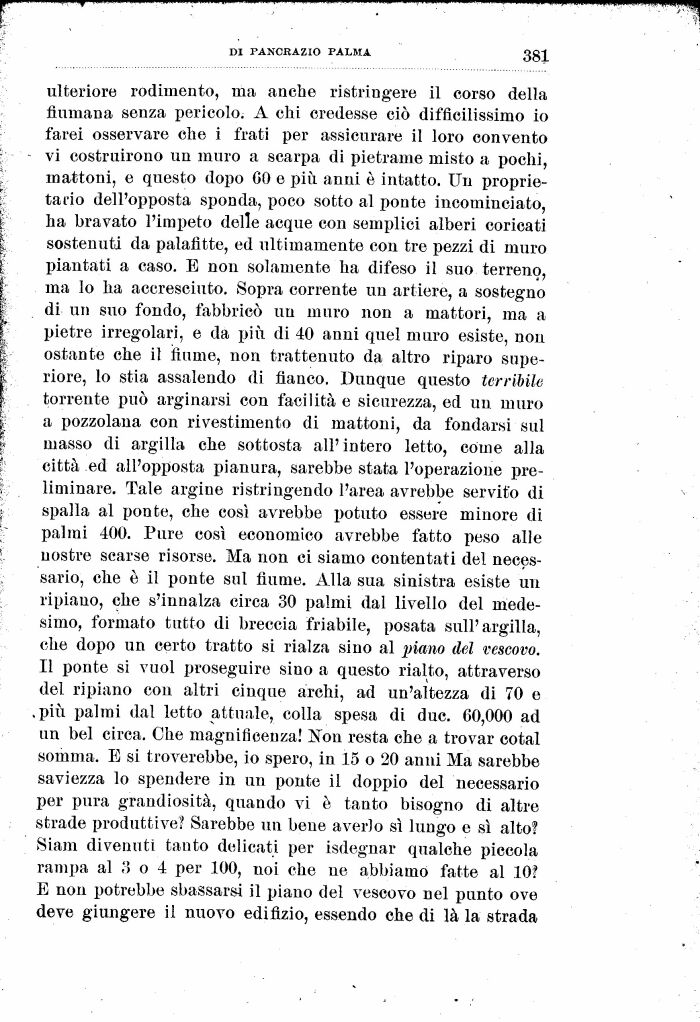 ulteriore rodimento, ma anche ristringere il corso della fiumana senza pericolo. A chi credesse ciò difficilissimo io farei osservare che i frati per assicurare il loro convento vi costruirono un muro a scarpa di pietrame misto a pochi, mattoni, e questo dopo 60 e più anni è intatto. Un proprietario dell'opposta sponda, poco sotto al ponte incominciato, ha bravato l'impeto delle acque con semplici alberi coricati sostenuti da palafitte, ed ultimamente con tre pezzi di muro piantati a caso. E non solamente ha difeso il suo terreno, ma lo ha accresciuto. Sopra corrente un artiere, a sostegno di un suo fondo, fabbricò un muro non a mattori, ma a pietre irregolari, e da più di 40 anni quel muro esiste, non ostante che il fiume, non trattenuto da altro riparo superiore, lo stia assalendo di fianco. Dunque questo terribile torrente può arginarsi con facilità e sicurezza, ed un muro a pozzolana con rivestimento di mattoni, da fondarsi sul masso di argilla che sottosta ali' intero letto, come alla città ed all'opposta pianura, sarebbe stata l'operazione preliminare. Tale argine ristringendo l'area avrebbe servito di spalla al ponte, che così avrebbe potuto essere minore di palmi 400. Pure così economico avrebbe fatto peso alle nostre scarse risorse. Ma non ci siamo contentati del necessario, che è il ponte sul fiume. Alla sua sinistra esiste un ripiano, che s'innalza circa 30 palmi dal livello del medesimo, formato tutto di breccia friabile, posata sull'argilla, che dopo un certo tratto si rialza sino al piano del vescovo. Il ponte si vuoi proseguire sino a questo rialto, attraverso del ripiano con altri cinque archi, ad un'altezza di 70 e .più palmi dal letto attuale, colla spesa di due. 60,000 ad un bel circa. Ohe magnificenza! Non resta che a trovar cotal somma. E si troverebbe, io spero, in 15 o 20 anni Ma sarebbe saviezza lo spendere in un ponte il doppio del necessario per pura grandiosità, quando vi è tanto bisogno di altre strade produttive? Sarebbe un. bene averlo sì lungo e sì alto? Siam divenuti tanto delicati per isdegnar qualche piccola rampa al «5 o 4 per 100, noi che ne abbiamo fatte al 10? E non potrebbe sbassarsi il piano del vescovo nel punto ove deve giungere il nuovo edifizio, essendo che di là la strada