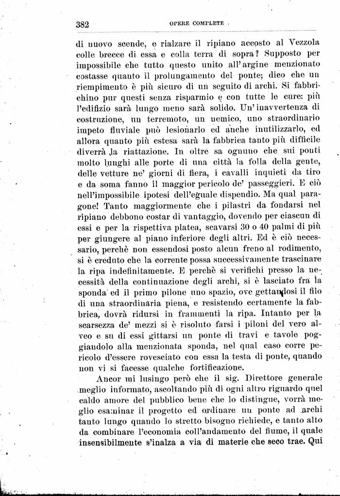 Ancor mi lusingo però che il sig. Direttore generale .meglio informato, ascoltando più di ogni altro riguardo quel caldo amore del pubblico bene che lo distingue, vorrà meglio esaminar il progetto ed ordinare un ponte ad _archi tanto lungo quando lo stretto bisogno richiede, e tanto alto da combinare l'economia coll'andamento del fiume, il quale insensibilmeute s'inalza a via di materie che seco trae. Qui