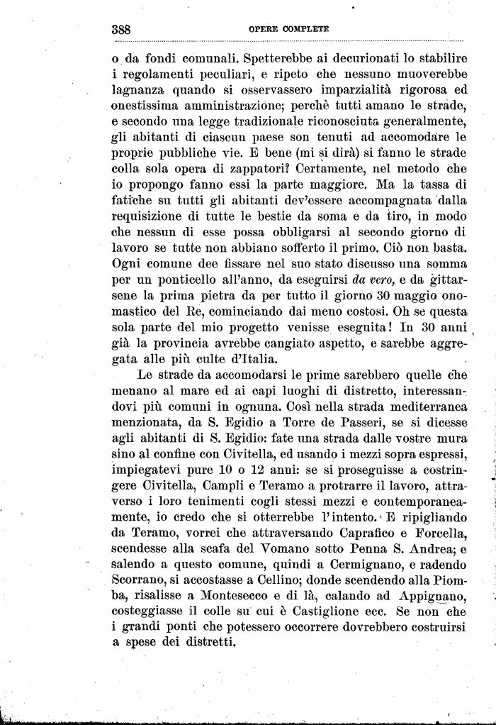 Le strade da accomodarsi le prime sarebbero quelle che menano al mare ed ai capi luoghi di distretto, interessandovi più comuni in ognuna. Così nella strada mediterranea menzionata, da 8. Egidio a Torre de Passeri, se si dicesse agli abitanti di S. Egidio: fate una strada dalle vostre mura sino al confine con Civitella, ed usando i mezzi sopra espressi, impiegatevi pure 10 o 12 anni: se si proseguisse a costringere Civitella, Campii e Teramo a protrarre il lavoro, attraverso i loro tenimenti cogli stessi mezzi e contemporaneamente, io credo che si otterrebbe l'intento. - E ripigliando da Teramo, vorrei che attraversando Caprafico e Forcella, scendesse alla scafa del Vomano sotto Penna S. Andrea; e salendo a questo comune, quindi a Cermignano, e radendo Scorrano, si accostasse a Celiino; donde scendendo alla Piomba, risalisse a Montesecco e di là, calando ad Appigliano, costeggiasse il colle su cui è Castiglione ecc. Se non che i grandi ponti che potessero occorrere dovrebbero costruirsi a spese dei distretti.
