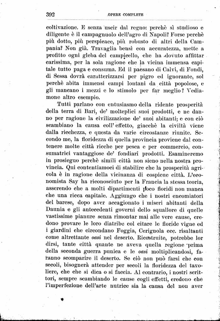 Tutti parlano con entusiasmo della ridente prosperità della terra di Bari, de' molteplici suoi prodotti, e ne danno per ragione la civilizzazione de' suoi abitanti; e con ciò scambiano la causa coli' effetto, giacché la civiltà viene dalla ricchezza, e questa da varie circostanze riunite. Secondo me, la floridezza di quella provincia proviene dal contenere molte città ricche per pesca e per commercio, con-sumatrici vantaggiose de' fondiari prodotti. Esamineremo in prosieguo perché simili città non sieno nella nostra provincia. Qui contentiamoci di stabilire che la prosperità agricola è in ragione della vicinanza di cospicue città. L'economista Say ha riconosciuto per la Francia la stessa teoria, asserendo che a molti dipartimenti p*oco floridi non manca che una ricca capitale. Aggiungo che i nostri encomiatori del barese, dopo aver accagionato i miseri abitanti della Daunia e gli antecedenti governi dello squallore di quelle vastissime pianure senza rimontar mai alle vere cause, credono provare le loro diatribe col citare le floride vigne ed i giardini che circondano Foggia, Cerignola ecc. risaltanti come altrettante oasi nel deserto. Bictfstruite, potrebbe lor dirsi, tante città quante ne aveva quella regione 'prima della seconda guerra punica e le oasi moltipllcandosi, faranno scomparire il deserto. Se ciò non può farsi che con secoli, bisognerà attender per secoli la floridezza del tavoliere, che che si dica o si faccia. Al contrario, i nostri scrittori, sempre scambiando le cause cogli effetti, credono che l'imperfezione dell'arte nutrice sia la causa del non aver