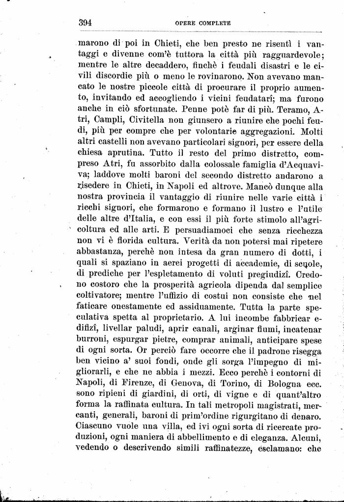 marono di poi in Chieti, che ben presto ne risentì i vantaggi e divenne com'è tuttora la città più ragguardevole; mentre le altre decaddero, finché i feudali disastri e le civili discordie più o meno le rovinarono. Non avevano mancato le nostre piccole città di procurare il proprio aumento, invitando ed accogliendo i vicini feudatarì; ma furono anche in ciò sfortunate. Penne potè far di più. Teramo, A-tri, Campii, Oivitella non giunsero a riunire che pochi feudi, più per compre che per volontarie aggregazioni. Molti altri castelli non avevano particolari signori, per essere della chiesa aprutina. Tutto il resto del primo distretto, compreso Atri, fu assorbito dalla colossale famiglia d'Acquavi-va; laddove molti baroni del secondo distretto andarono a risedere in Chieti, in Napoli ed altrove. Mancò dunque alla nostra provincia il vantaggio di riunire nelle varie città i ricchi signori, che formarono e formano il lustro e l'utile delle altre d'Italia, e con essi il più forte stimolo all'agricoltura ed alle arti. E persuadiamoci che senza ricchezza non vi è florida cultura. Verità da non potersi mai ripetere abbastanza, perché non intesa da gran numero di dotti, i quali si spaziano in aerei progetti di accademie, di scuole, di prediche per l'espletamento di voluti pregiudizi. Credono costoro che la prosperità agricola dipenda dal semplice coltivatore; mentre l'uffizio di costui non consiste che -nel faticare onestamente ed assiduamente. Tutta la parte speculativa spetta al proprietario. A lui incombe fabbricar e-difizì, livellar paludi, aprir canali, arginar fiumi, incatenar burroni, espurgar pietre, comprar animali, anticipare spese di ogni sorta. Or perciò fare occorre che il padrone risegga ben vicino a' suoi fondi, onde gli sorga l'impegno di migliorarli, e che ne abbia i mezzi. Ecco perché i contorni di Napoli, di Firenze, di Genova, di Torino, di Bologna ecc. sono ripieni di giardini, di orti, di vigne e di quant'altro forma la raffinata cultura. In tali metropoli magistrati, mercanti, generali, baroni di prim'ordine rigurgitano di denaro. Ciascuno vuole una villa, ed ivi ogni sorta di ricercate produzioni, ogni maniera di abbellimento e di eleganza. Alcuni, vedendo o descrivendo simili raffinatezze, esclamano: che