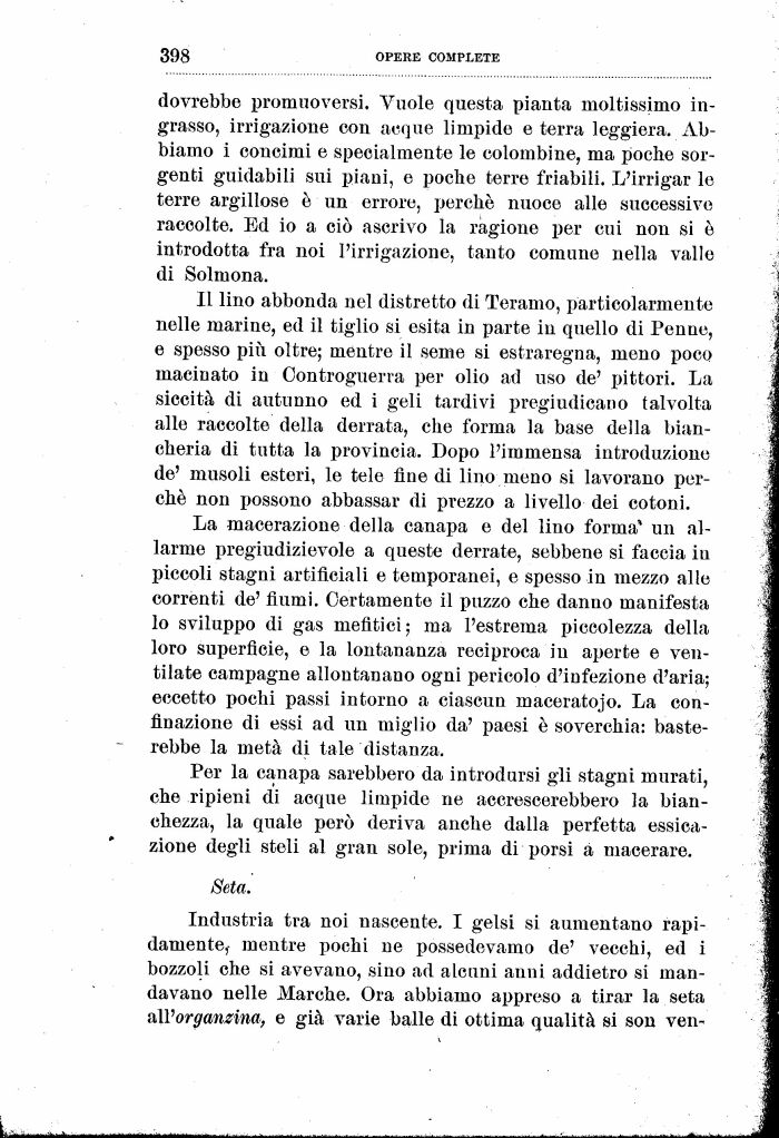 dovrebbe promuoversi. Vuole questa pianta moltissimo ingrasso, irrigazione con acque limpide e terra leggiera. Abbiamo i concimi e specialmente le colombine, ma poche sorgenti guidabili sui piani, e poche terre friabili. L'irrigar le terre argillose è un errore, perché nuoce alle successive raccolte. Ed io a ciò ascrivo la ragione per cui non si è introdotta fra noi l'irrigazione, tanto comune nella valle di Solmona.