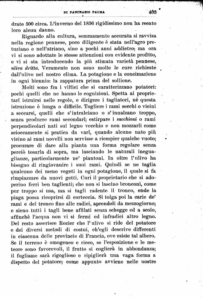 Eiguardo alla cultura, sommamente accurata si ravvisa nella regione pennese, poco diligente è stata nell'agro pre-tuziano e nell'atriano, sino a pochi anni addietro; ma ora vi si sono adottate le stesse attenzioni con evidente profitto, e vi si sta introducendo la più stimata varietà pennese, ulivo, dritta. Veramente non sono molte le cure richieste dall'ulivo nel nostro clima. La potagione e la concimazione in ogni biennio: la zappatura prima del sollione.