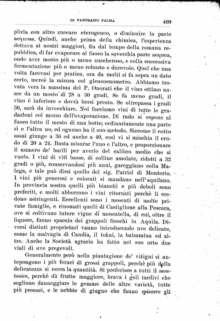 plirla con altro zuccaro eterogeneo, o diminuire la parte acquosa. Quindi, anche prima della chimica, l'esperienza dettava ai nostri maggiori, fin dal tempo della romana repubblica, di far evaporare al fuoco la soverchia parte acquea, onde aver mosto, più o meno zuccheroso, e colla successiva fermentazione più o meno robusto e durevole. Quel che una volta facevasi per pratica, ora da molti si fa sopra un dato certo, mercé la misura col gleucoenometro. Abbiamo trovata vera la massima del P. Onorati che il vino ottimo nasce da un mosto'di 28 a 30 gradi. Se fa meno gradi, il vino è inferiore e dovrà bersi presto. Se oltrepassa i gradi 30, sarà da invecchiare. Noi facciamo vini di tutte le gradazioni col mezzo dell'evaporazione. Di rado si espone al fuoco tutto il mosto di una botte; ordinariamente una parte sì e l'altra no, ed ognuno ha il suo. metodo. Siccome il cotto assai giunge a 36 ed anche a 40, così vi si mischia il crudo di 20 a 24. Basta misurar l'uno e l'altro, e proporzionare il numero de' barili per averlo del calibro medio che si vuole. I vini di viti basse, di colline assolate, ridotti a 32 gradi o più, conservandosi più anni, gareggiano colla Ma-•laga, e tale può dirsi quello del sig. Patrizi di Montorio. 1 vini più generosi e colorati si mandano nell'aquilano. In provincia nostra quelli più bianchì e più deboli sono preferiti, e molti abborrono i vini ritornati perché li credono astringenti. Eccellenti sono i moscati di molte private famiglie, e rinomati quelli di Castiglione alla Pescara, ove si coltivano intere vigne di moscatella, di cui, oltre il liquore, fanno spaccio dei grappoli freschi in Aquila. Diversi distinti proprietarì vanno iìitroducendo uve delicate, come la malvagia di Oandia, il tokai, la balsamina ed altre. Anche la Società agraria ha fatto nel suo orto due viali di uve pregevoli.