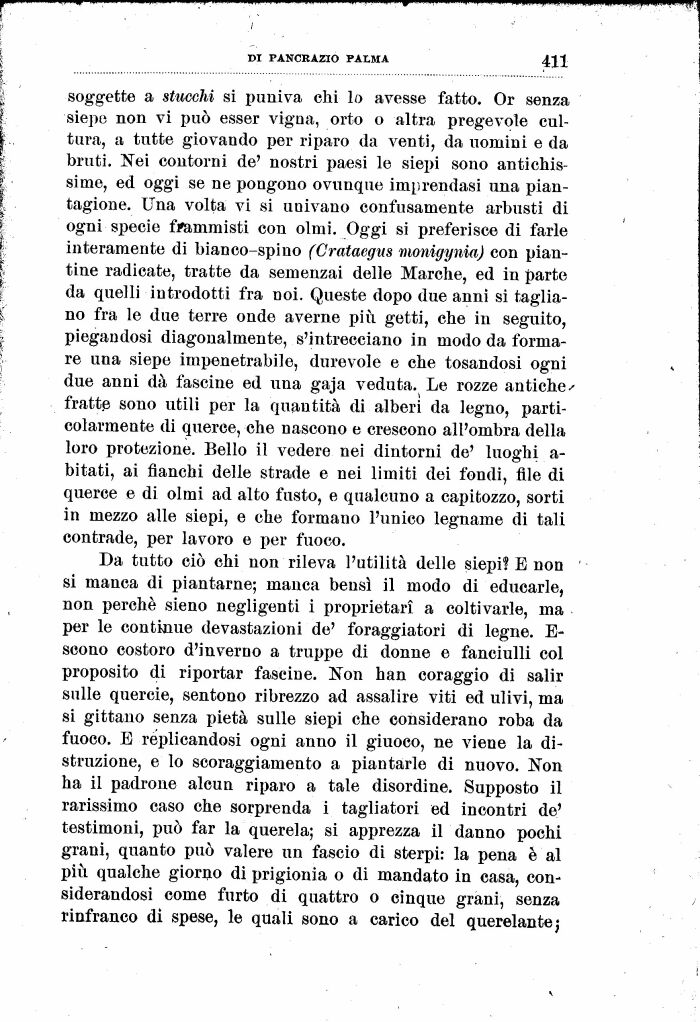 soggette a stucchi si puniva chi lo avesse fatto. Or senza siepe non vi può esser vigna, orto o altra pregevole cultura, a tutte giovando per riparo da venti, da uomini e da bruti. Nei contorni de' nostri paesi le siepi sono antichissime, ed oggi se ne pongono ovunque imprendasi una piantagione. Una volta vi si univano confusamente arbusti di ogni specie frammisti con olmi. Oggi si preferisce di farle interamente di bianco-spino (Crataegm monigynia) con piantine radicate, tratte da semenzai delle Marche, ed in parte da quelli introdotti fra noi. Queste dopo due anni si tagliano fra le due terre onde averne più getti, che in seguito, piegandosi diagonalmente, s'intrecciano in modo da formare una siepe impenetrabile, durevole e che tosandosi ogni due anni da fascine ed una gaja veduta. Le rozze antiche.-fratte sono utili per la quantità di alberi da legno, particolarmente di querce, che nascono e crescono all'ombra della loro protezione. Bello il vedere nei dintorni de' luoghi a-bitati, ai fianchi delle strade e nei limiti dei fondi, file di querce e di olmi ad alto fusto, e qualcuno a capitozzo, sorti in mezzo alle siepi, e che formano l'unico legname di tali contrade, per lavoro e per fuoco.