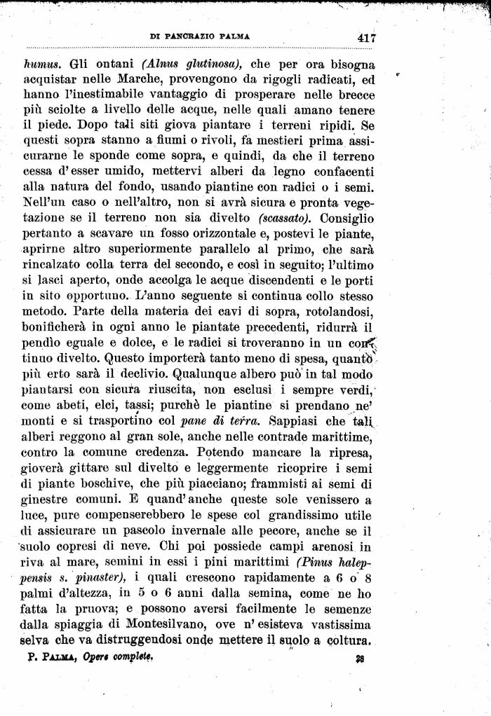 humus. Gli ontani (Alnus glutinosa), che per ora bisogna acquistar nelle Marche, provengono da rigogli radicati, ed hanno l'inestimabile vantaggio di prosperare nelle brecce più sciolte a livello delle acque, nelle quali amano tenere il piede. Dopo tali siti giova piantare i terreni ripidi. Se questi sopra stanno a fiumi o rivoli, fa mestieri prima assicurarne le sponde come sopra, e quindi, da che il terreno cessa d'esser umido, mettervi alberi da legno confacenti alla natura del fondo, usando piantine con radici o i semi. Nell'un caso o nell'altro, non si avrà sicura e pronta vegetazione se il terreno non sia divelto (scassato). Consiglio pertanto a scavare un fosso orizzontale e, postevi le piante, aprirne altro superiormente parallelo al primo, che sarà rincalzato colla terra del secondo, e così in seguito; l'ultimo si lasci aperto, onde accolga le acque discendenti e le porti in sito opportuno. L'anno seguente si continua collo stesso metodo. Parte della materia dei cavi di sopra, rotolandosi, bonificherà in ogni anno le piantate precedenti, ridurrà il pendìo eguale e dolce, e le radici si troveranno in un conC tinuo divelto. Questo importerà tanto meno di spesa, quanti! più erto sarà il declivio. Qualunque albero può in tal modo piantarsi con sicura riuscita, non esclusi i sempre verdi, come abeti, elei, tassi; purché le piantine si prendano ne' monti e si trasportino col pane di terra. Sappiasi che tal^ alberi reggono al gran sole, anche nelle contrade marittime, contro la comune credenza. Potendo mancare la ripresa, gioverà gittare sul divelto e leggermente ricoprire i semi di piante boschive, che più piacciano; frammisti ai semi di ginestre comuni. E quand'anche queste sole venissero a luce, pure compenserebbero le spese col grandissimo utile di assicurare un pascolo invernale alle pecore, anche se il .suolo copresi di neve. Ohi poi possiede campi arenosi in riva al mare, semini in essi i pini marittimi (Pinus halep-pensis s. pinaster), i quali crescono rapidamente a 6 o 8 palmi d'altezza, in 5 o 6 anni dalla semina, come ne ho fatta la prtiova; e possono aversi facilmente le semenze dalla spiaggia di Montesilvano, ove n' esisteva vastissima selva che va distruggendosi onde mettere il suolo a coltura. P. PAJJBA, Operi complete. %