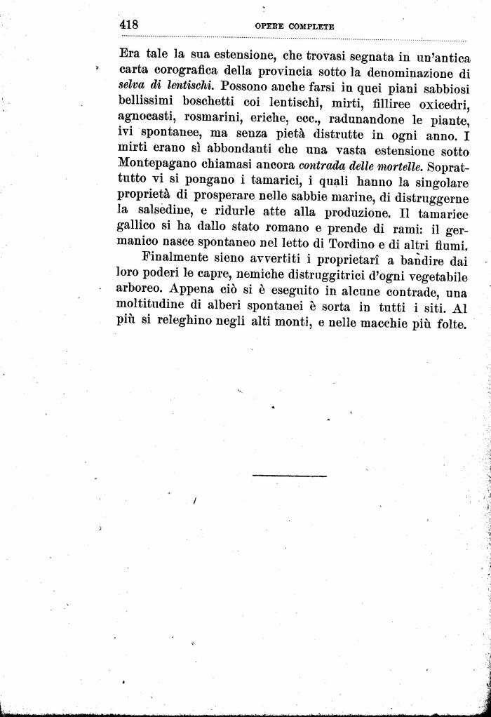 Era tale la sua estensione, che trovasi segnata in un'antica carta corografica della provincia sotto la denominazione di selva di lentischi. Possono anche farsi in quei piani sabbiosi bellissimi boschetti coi lentischi, mirti, fìlliree oxicedri, agnocasti, rosmarini, eriche, ecc., radunandone le piante, ivi spontanee, ma senza pietà distrutte in ogni anno. I mirti erano sì abbondanti che una vasta estensione sotto Montepagano chiamasi ancora contrada delle mortelle. Soprattutto vi si pongano i tamarici, i quali hanno la singolare proprietà di prosperare nelle sabbie marine, di distruggerne la salsedine, e ridurle atte alla produzione. Il tamarice gallico si ha dallo stato romano e prende di rami: il germanico nasce spontaneo nel letto di Tordino e di altri fiumi. Finalmente sieno avvertiti i proprietarì a bandire dai loro poderi le capre, nemiche distruggitrici d'ogni vegetabile arboreo. Appena ciò si è eseguito in alcune contrade, una moltitudine di alberi spontanei è sorta in tutti i siti. Al più si releghino negli alti monti, e nelle macchie più folte.