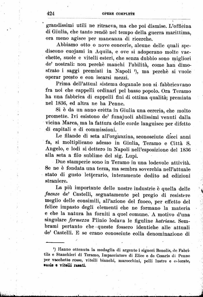 La più importante delle nostre industrie è quella delle faenze de' Castelli, segnatamente pel pregio di resistere meglio delle consimili, all'azione del fuoco, per effetto del felice impasto degli elementi che ne formano la materia e che la natura ha forniti a quel comune. A motivo d'una singolare fermerà Plinio lodava le figuline hatriane. Sembrami pertanto che • queste fossero identiche alle attuali de' Castelli. E se erano conosciute colla denominazione di