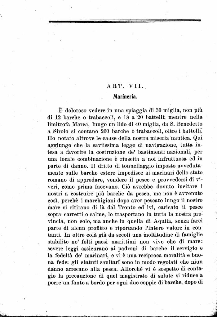È doloroso vedere in una spiaggia di 30 miglia, non più di 12 barche o trabaccoli, e 18 a 20 battelli; mentre nella limitrofa Marca, lungo un lido di 40 miglia, da S. Benedetto a Sirolo si contano 200 barche o trabaccoli, oltre i battelli Ho notato altrove le cause della nostra miseria nautica. Qui aggiungo che la saviissima legge di navigazione, tutta intesa a favorire la costruzione de' bastimenti nazionali, per una locale combinazione è riuscita a noi infruttuosa ed in parte di danno. Il dritto di tonnellaggio imposto avvedutamente sulle barche estere impedisce ai marinari dello stato romano di approdare, vendere il pesce e provvedersi di viveri, come prima facevano. Ciò avrebbe dovuto incitare i nostri a costruire più barche da pesca, ma non è avvenuto così, perché i marchigiani dopo aver pescato lungo il nostro mare si ritirano di là dal Trento ed ivi, caricato il pesce sopra carretti o salme, lo trasportano in tutta la nostra provincia, non solo, ma anche in quella di Aquila, senza farci parte di alcun profitto e riportando l'intero valore in contanti. In oltre colà già da secoli una moltitudine di famiglie stabilite ne' folti paesi marittimi non vive che di mare: severe leggi assicurano ai padroni di barche il servigio e la fedeltà de' marinari, e vi è una reciproca moralità e buona fede: gli statuti sanitarì sono in modo regolati che niun danno arrecano alla pesca. Allorché vi è sospetto di contagio la precauzione di quel magistrato di salute si riduce a porre un fante a bordo per ogni due coppie di barche, dopo di