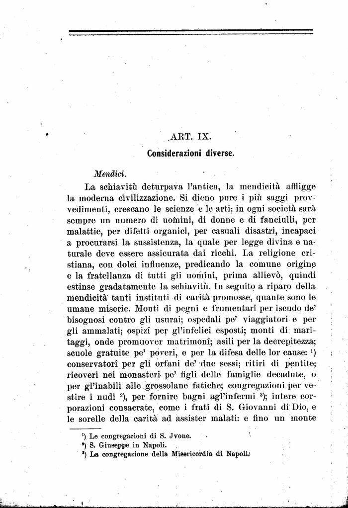 La schiavitù deturpava l'antica, la mendicità affligge la moderna civilizzazione. Si dieno pure i più saggi provvedimenti, crescano le scienze e le arti; in ogni società sarà sempre un numero di uomini, di donne e di fanciulli, per malattie, per difetti organici, per casuali disastri, incapaci a procurarsi la sussistenza, la quale per legge divina e naturale deve essere assicurata dai ricchi. La religione cristiana, con dolci influenze, predicando la comune origine e la fratellanza di tutti gii uomini, prima allievo, quindi estinse gradatamente la schiavitù. In seguito a riparo della mendicità tanti instituti di carità promosse, quante sono le umane miserie. Monti di pegni e frumentarì per iscudo de' bisognosi contro gli usurai; ospedali pe' viaggiatori e per gli ammalati; ospizi per gl'infelici esposti; monti di maritaggi, onde promuover matrimoni; asili per la decrepitezza; scuole gratuite pe' poveri, e per la difesa delle lor cause: ') conservatori per gli orfani de' :due sessi; ritiri di pentite; ricoveri nei monasteri pe' figli delle famiglie decadute, o per gl'inabili alle grossolane fatiche; congregazioni per vestire i nudi 2), per fornire bagni agl'infermi 3); intere corporazioni consacrate, come i frati di S. Giovanni di Dio, e le sorelle della carità ad assister malati: e fino un monte