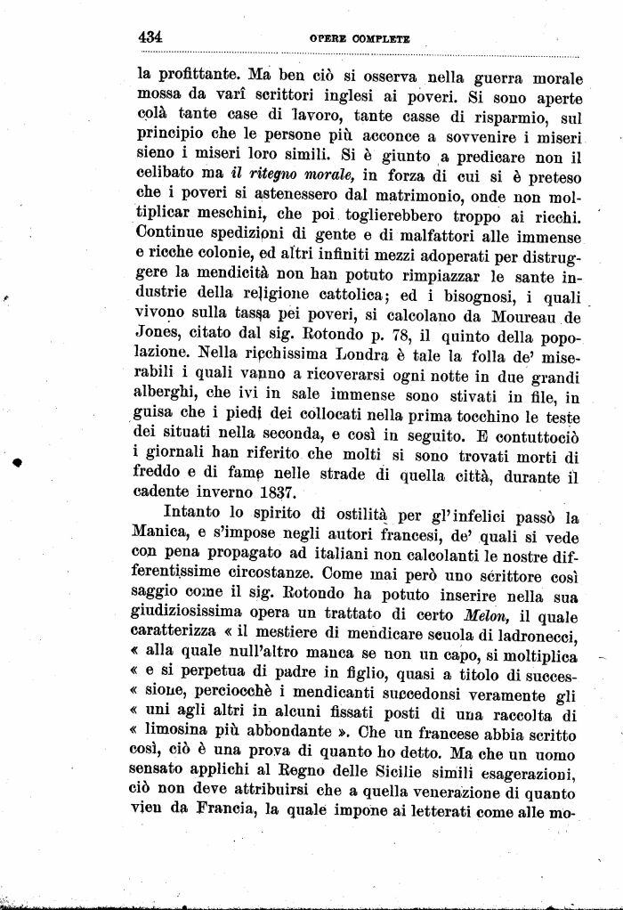 Intanto lo spirito di ostilità per gl'infelici passò la Manica, e s'impose negli autori francesi, de' quali si vede con pena propagato ad italiani non calcolanti le nostre dif-ferentissime circostanze. Come mai però uno scrittore così saggio come il sig. Eotondo ha potuto inserire nella sua giudiziosissima opera un trattato di certo Melon, il quale caratterizza « il mestiere di mendicare scuola di ladronecci, « alla quale null'altro manca se non un capo, si moltiplica « e si perpetua di padre in figlio, quasi a titolo di succes-« sioue, perciocché i mendicanti succedonsi veramente gli « uni agli altri in alcuni fissati posti di una raccolta di « limosina più. abbondante ». Che un francese abbia scritto così, ciò è una prova di quanto ho detto. Ma che un uomo sensato applichi al Eegno delle Sicilie simili esagerazioni, ciò non deve attribuirsi che a quella venerazione di quanto vjen da Francia, la quale impone ai letterati come alle mo-