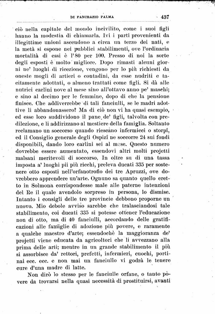 ciò nella capitale del mondo incivilito, come i suoi figli hanno la modestia di chiamarla. Ivi i parti provenienti da illegittime unioni ascendono a circa un terzo dei nati, e la metà si espone nei pubblici stabilimenti, ove l'ordinaria mortalità di essi è l'80 per 100. Presso di noi la sorte degli esposti è molto migliore. Dopo rimasti alcuni giorni ne' luoghi di ricezione, vengono per lo più richiesti da oneste mogli di artieri o contadini, da esse nudriti e tacitamente adottati, o almeno trattati come figli. Si da alle nutrici carlini nove al mese sino all'ottavo anno pe' maschi; e sino al decimo per le femmine, dopo di che la pensione finisce. Che addiverrebbe di tali fanciulli, se le madri adottive li abbandonassero? Ma di ciò non vi ha quasi esempio, ed esse loro suddividono il pane, de' figli, talvolta con predilezione, e li addirizzano al mestiere della famiglia. Soltanto reclamano un soccorso quando riescano infermicci o storpi, ed il Consiglio generale degli Ospizi ne soccorre 24 sui fondi disponibili, dando loro carlini sei al mese. Questo numero dovrebbe essere aumentato, essendovi altri molti projetti malsani meritevoli di soccorso. In oltre su di una tassa imposta a' luoghi pii più ricchi, preleva ducati 335 per sostenere otto esposti nell'orfanotrofio dei tre Apruzzi, ove dovrebbero apprendere un'arte. Ognuno sa quanto quello eretto in Solmona corrispondesse male alle paterne intenzioni del Ee il quale avendolo sorpreso in persona, lo dismise. Intanto i consigli delle tre provincie debbono proporne un nuovo. Mio debole avviso sarebbe che tralasciandosi tale stabilimento, coi ducati 335 si potesse ottener l'educazione non di otto, ma di 40 fanciulli, accordando delle gratificazioni alle famiglie di adozione più povere, e raramente a qualche maestro d'arte; essendoché la maggioranza de' projetti viene educata da agricoltori che li avvezzano alla prima delle arti; mentre in un grande stabilimento il più si assorbisce da' rettori, prefetti, infermieri, cuochi, portinai ecc. ecc. e non mai un fanciullo vi godrà le tenere cure d'una madre di latte.