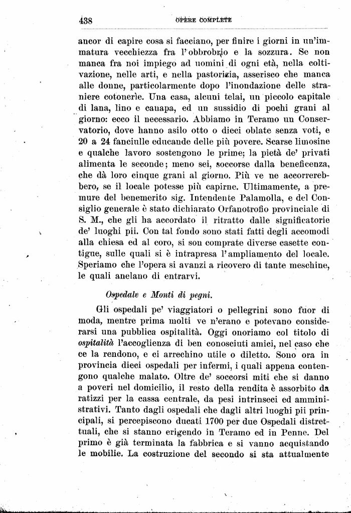 Gli ospedali pe' viaggiatori o pellegrini sono fuor di moda, mentre prima molti ve n'erano e potevano considerarsi una pubblica ospitalità. Oggi onoriamo col titolo di ospitalità l'accoglienza di ben conosciuti amici, nel caso che ce la rendono, e ci arrechino utile o diletto. Sono ora in provincia dieci ospedali per infermi, i quali appena contengono qualche malato. Oltre de' soccorsi miti che si danno a poveri nel domicilio, il resto della rendita è assorbito da ratizzi per la cassa centrale, da pesi intrinseci ed amministrativi. Tanto dagli ospedali che dagli altri luoghi pii principali, si percepiscono ducati 1700 per due Ospedali distrettuali, che si stanno erigendo in Teramo ed in Penne. Del primo è già terminata la fabbrica e si vanno acquistando le mobilie. La costruzione del secondo si sta attualmente