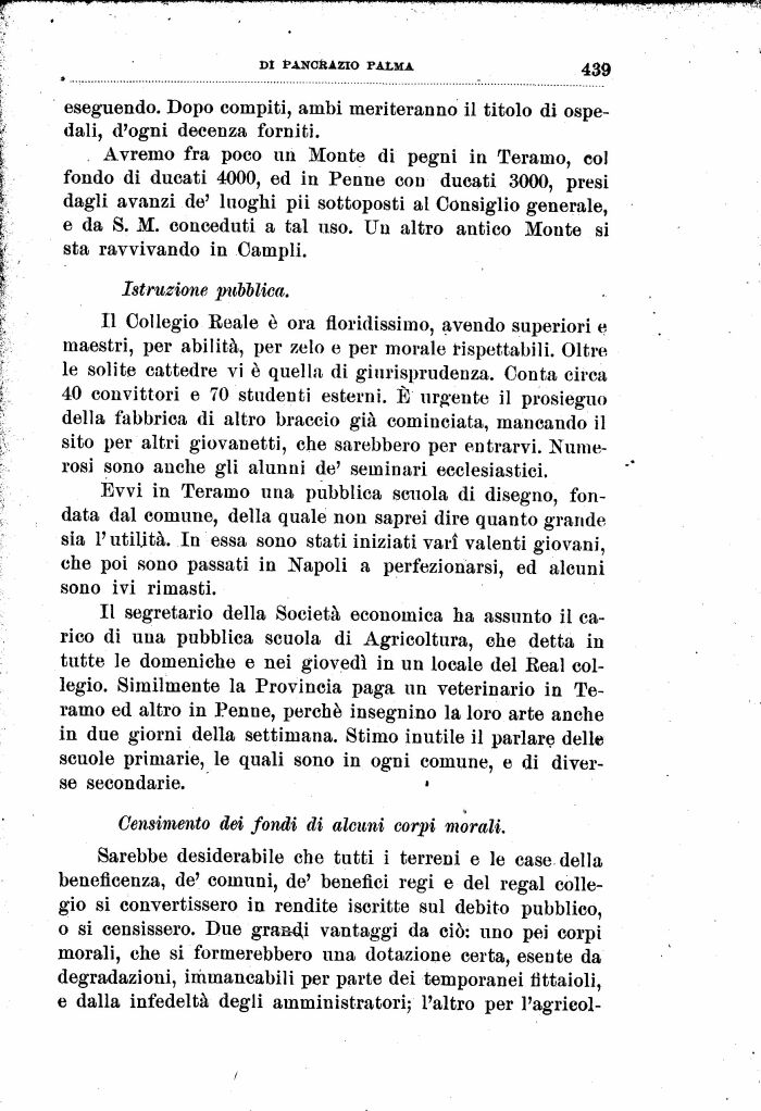 Sarebbe desiderabile che tutti i terreni e le case della beneficenza, de' comuni, de' benefici regi e del regal collegio si convertissero in rendite iscritte sul debito pubblico, o si censissero. Due graadj vantaggi da ciò: uno pei corpi morali, che si formerebbero una dotazione certa, esente da degradazioni, immancabili per parte dei temporanei fittaioli, e dalla infedeltà degli amministratori; l'altro per l'agrieol-