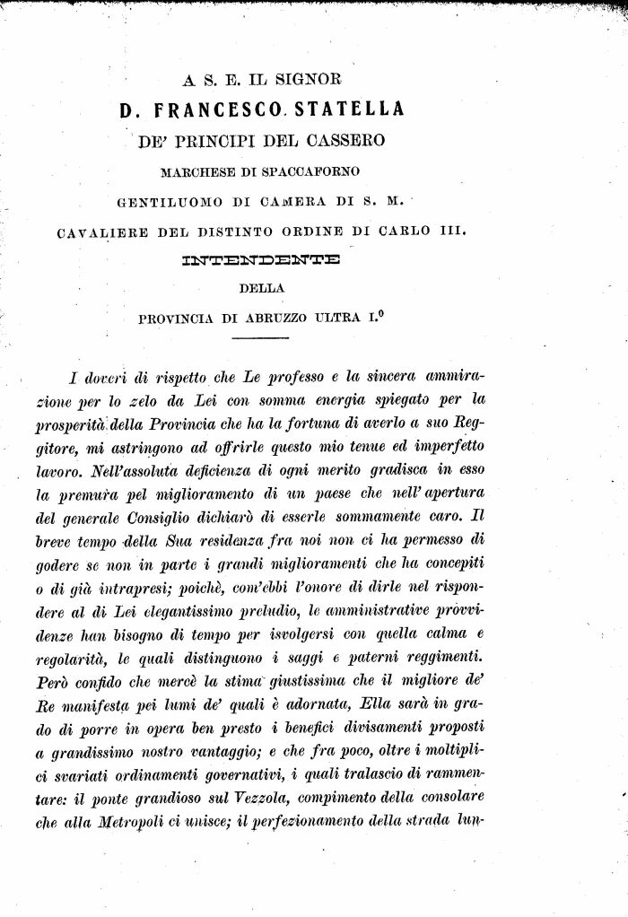 I doveri di rispetto die Le professo e la sincera ammirazione per lo zelo da Lei con somma energia spiegato per la prosperità della Provincia die lia la fortuna di averlo a suo Reggitore, mi astringono ad offrirle questo mio tenue ed imperfetto lavoro. Nell'assoluta deficienza di ogni merito gradisca in esso la premura pel miglioramento di un paese die nell'apertura del generale Consiglio dicliiarò di esserle sommamente caro. Il breve tempo della Sua residenza fra noi non ci lia permesso di godere se non in parte i grandi miglioramenti die lia concepiti o di già intrapresi; poidiè, coni'ebbi l'onore di dirle nel rispondere al di Lei elegantissimo preludio, le amministrative provvidenze lian bisogno di tempo per involgersi con quella calma e regolarità, le quali distinguono i saggi e paterni reggimenti. Però confido die mercé la stima. giustissima die il migliore de' He manifesta pei lumi de' quali è adornata, Ella sarà in grado di porre in opera ben presto i benefici divisamenti proposti a grandissimo nostro vantaggio; e die fra poco, oltre i moltipli-ci svariati ordinamenti governativi, i quali tralascio di rammentare: il ponte grandioso sul Vezzola, compimento della consolare die alla Metropoli ci unisce; il perfezionamento della strada lun-