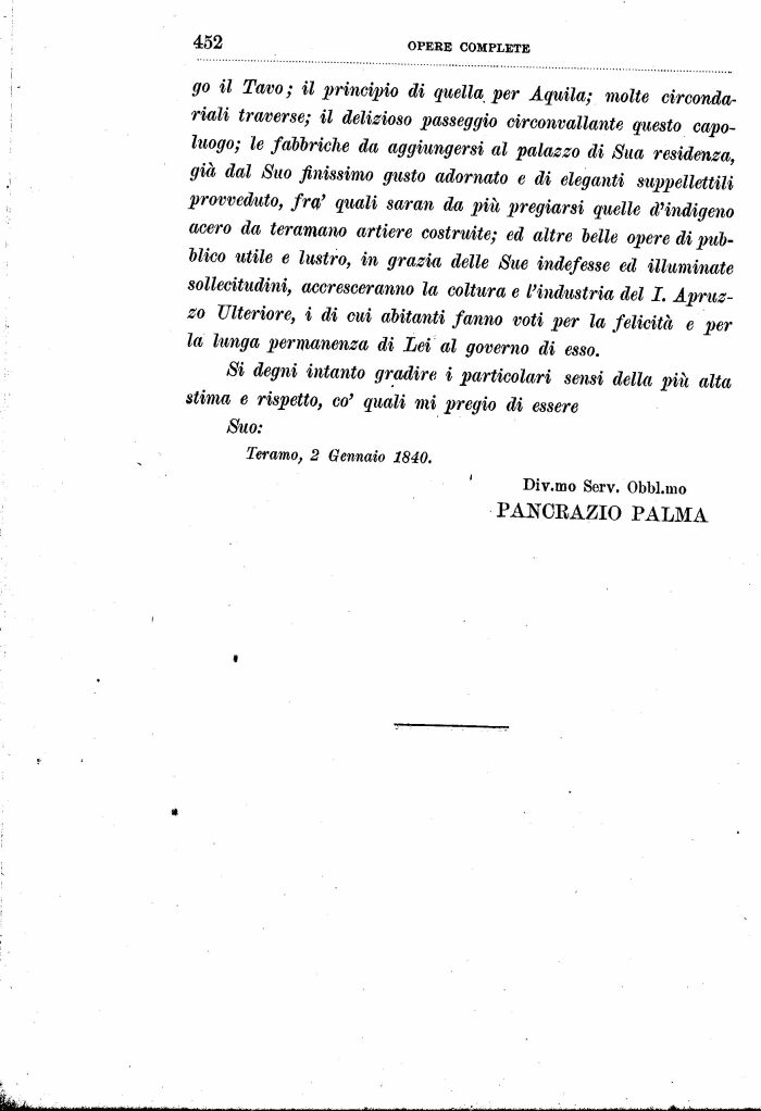 go il Tavo; il principio di quella per Aquila; molte circondariali traverse; il delizioso passeggio circonvallante questo capo-luogo; le fabbriche da aggiungersi al palazzo di Sua residenza, gią dal Suo finissimo gusto adornato e di eleganti suppellettili provveduto, fra' quali saran da pił pregiarsi quelle d'indigeno acero da teramatw artiere costruite; ed altre belle opere di pubblico utile e lustro, in grazia delle Sue indefesse ed illuminate sollecitudini, accresceranno la coltura e l'industria del I. Apruz-zo Ulteriore, i di cui abitanti fanno voti per la felicitą e per la lunga permanenza di Lei al governo di esso.