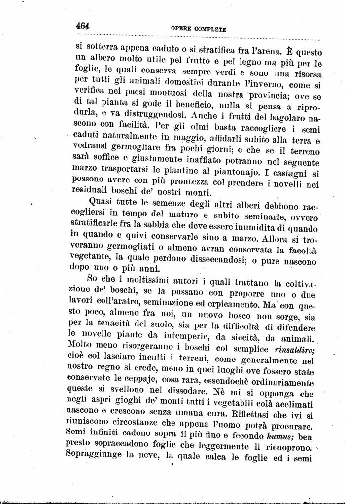 So che i moltissimi autori i quali trattano la coltivazione de' boschi, se la passano con proporre uno o due lavori coll'aratro, seminazione ed erpicamento. Ma con questo poco, almeno fra noi, un nuovo bosco non sorge, sia per la tenacità del suolo, sia per la difficoltà di difendere le novelle piante da intemperie, da siccità, da animali. Molto meno risorgeranno i boschi col semplice rinsaldire; cioè col lasciare inculti i terreni, come generalmente nel nostro regno si crede, meno in quei luoghi ove fossero state conservate le ceppaje, cosa rara, essendoché ordinariamente queste si svellono nel dissodare. Né mi si opponga che negli aspri gioghi de' monti tutti i vegetabili colà acclimati nascono e crescono senza umana cura. Riflettasi che ivi si riuniscono circostanze che appena l'uomo potrà procurare. Semi infiniti cadono sopra il più fino e fecondo humus; ben presto sopraccadono foglie che leggermente li ricuoprono. Sopraggiunge la neve, la quale calca le foglie ed i semi