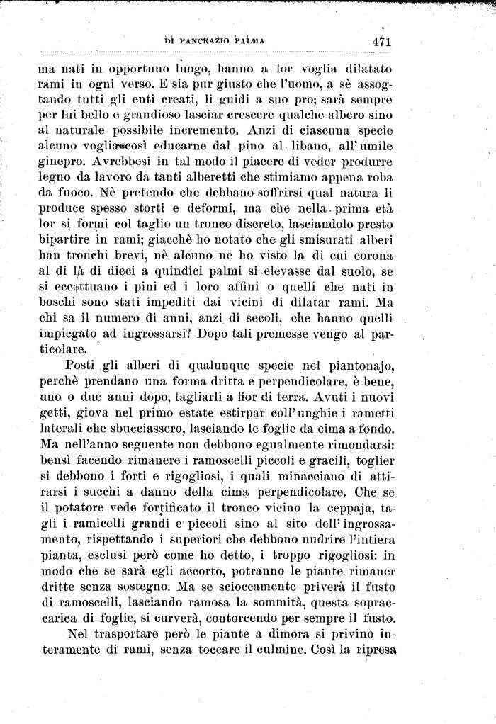 Posti gli alberi di qualunque specie nel piantonajo, perché prendano una forma dritta e perpendicolare, è bene, uno o due anni dopo, tagliarli a fior di terra. Avuti i nuovi getti, giova nel primo estate estirpar coli' unghie i rametti laterali che sbucciassero, lasciando le foglie da cima a fondo. Ma nell'anno seguente non debbono egualmente rimondarsi: bensì facendo rimanere i ramoscelli piccoli e gracili, toglier si debbono i forti e rigogliosi, i quali minacciano di attirarsi i succhi a danno della cima perpendicolare. Ohe se il potatore vede fortificato il tronco vicino la ceppaja, tagli i ramiceli! grandi e piccoli sino al sito dell'ingrossamento, rispettando i superiori che debbono nudrire l'intiera pianta, esclusi però come ho detto, i troppo rigogliosi: in modo che se sarà egli accorto, potranno le piante rimaner dritte senza sostegno. Ma se scioccamente priverà il fusto di ramoscelli, lasciando ramosa la sommità, questa sopraccarica di foglie, si curverà, contorcendo per sempre il fusto.