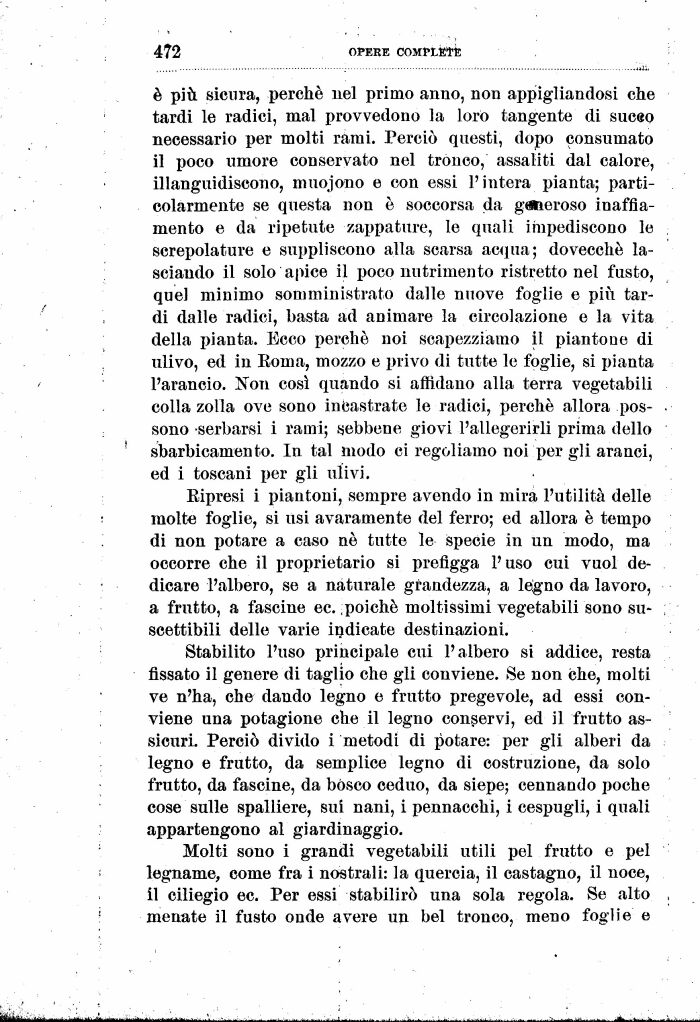Stabilito l'uso principale cui l'albero si addice, resta fissato il genere di taglio che gli conviene. Se non che, molti ve n'ha, che dando legno e frutto pregevole, ad essi conviene una potagione che il legno conservi, ed il frutto assicuri. Perciò divido i metodi di potare: per gli alberi da legno e frutto, da semplice legno di costruzione, da solo frutto, da fascine, da bòsco ceduo, da siepe; cennando poche cose sulle spalliere, sui nani, i pennacchi, i cespugli, i quali appartengono al giardinaggio.
