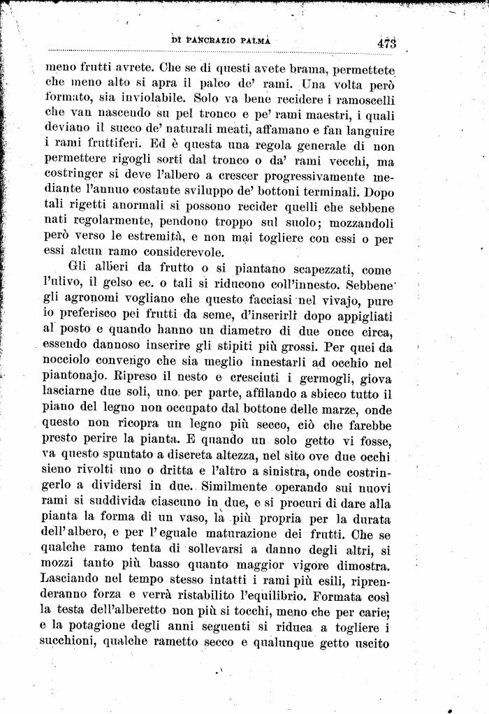 meno fratti avrete. Ohe se di questi avete brama, permettete che meno alto si apra il palco de' rami. Una volta però formato, sia inviolabile. Solo va bene recidere i ramoscelli che van nascendo su pel tronco e pe' rami maestri, i quali deviano il succo de' naturali meati, affamano e fan languire i rami fruttiferi. Ed è questa una regola generale di non permettere rigogli sorti dal tronco o da' rami vecchi, ma costringer si deve l'albero a crescer progressivamente mediante l'annuo costante sviluppo de' bottoni terminali. Dopo tali rigetti anormali si possono recider quelli che sebbene nati regolarmente, pendono troppo sul suolo; mozzandoli però verso le estremità, e non mai togliere con essi o per essi alcun ramo considerevole.