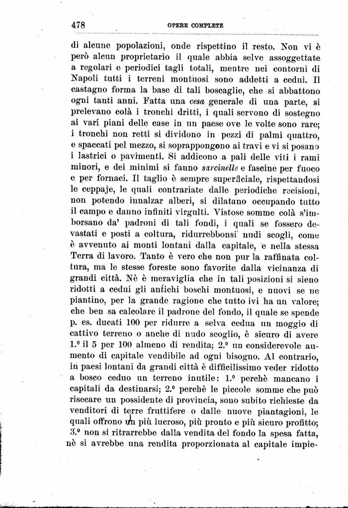 di alcune popolazioni, onde rispettino il resto. Non vi è però alcun proprietario il quale abbia selve assoggettate a regolari e periodici tagli totali, mentre nei contorni di Napoli tutti i terreni montuosi sono addetti a cedui. Il castagno forma la base di tali boscaglie, che si abbattono ogni tanti anni. Fatta una cesa generale di una parte, si prelevano colà i tronchi dritti, i quali servono di sostegno ai vari piani delle case in un paese ove le volte sono rare; i tronchi non retti si dividono in pezzi di palmi quattro, e spaccati pel mezzo, si soprappongono ai travi e vi si posano i lastrici o pavimenti. Si addicono a pali delle viti i rami minori, e dei minimi si fanno sarcinelle e fascine per fuoco e per fornaci. Il taglio è sempre superficiale, rispettandosi le ceppaje, le quali contrariate dalle periodiche recisioni, non potendo innalzar alberi, si dilatano occupando tutto il campo e danno infiniti virgulti. Vistose somme colà s'imborsano da' padroni di tali fondi, i quali se fossero devastati e posti a coltura, ridurrebbonsi. nudi scogli, come è avvenuto ai monti lontani dalla capitale, e nella stessa Terra di lavoro. Tanto è vero che non pur la raffinata coltura, ma le stesse foreste sono favorite dalla vicinanza di grandi città. Né è meraviglia che in tali posizioni si sieno ridotti a cedui gli antichi boschi montuosi, e nuovi se ne piantino, per la grande ragione che tutto ivi ha un valore; che ben sa calcolare il padrone del fondo, il quale se spende p. es. ducati 100 per ridurre a selva cedua un moggio di cattivo terreno o anche di nudo scoglio, è sicuro di avere 1.° il 5 per 100 almeno di rendita; 2.° un considerevole aumento di capitale vendibile ad ogni bisogno. Al contrario, in paesi lontani da grandi città è difficilissimo veder ridotto a bosco ceduo un terreno inutile: 1.° perché mancano i capitali da destinarsi; 2.° perché le piccole somme che può risecare un possidente di provincia, sono subito richieste da venditori di terre fruttifere o dalle nuove piantagioni, le quali offrono iyn più lucroso, più pronto e più sicuro profitto; 3.° non si ritrarrebbe dalla vendita del fondo la spesa fatta, né si avrebbe una rendita proporzionata al capitale impie-
