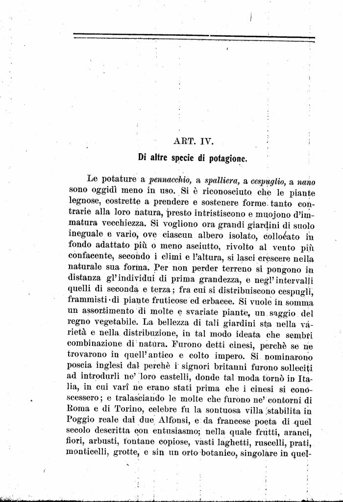 Le potature a pennacchio, a spalliera, a cespuglio, a nano sono oggidì meno in uso. Si è riconosciuto che le piante legnose, costrette a prendere e sostenere forme tanto contrarie alla loro natura, presto intristiscono e muojono d'immatura vecchiezza. Si vogliono ora grandi giardini dì suolo ineguale e vario, ove ciascun albero isolato, collocato in fondo adattato più o meno asciutto, rivolto al vento più confacente> secondo i climi e l'altura, si lasci crescere nella naturale sua forma. Per non perder terreno si pongono in distanza gl'individui di prima grandezza, e negl'intervalli quelli di seconda e terza ; fra cui si distribuiscono cespugli, frammisti-di piante fruticose ed erbacee. Si vuole in somma un assortimento di molte e svariate piante, un. saggio. del regno vegetabile. La bellezza di tali giardini sta nella varietà e nella distribuzione, in tal modo ideata che sembri combinazione di natura. Furono detti cinesi, perché se ne trovarono in quell'antico e colto impero. Si nominarono poscia inglesi dal perché i signori britanni furono solleciti ad introdurli ne' loro castelli, donde tal moda tornò in Italia, in cui vari ne erano stati prima che i cinesi si conóscessero; e tralasciando le molte che furono ne'contorni di Boma e di Torino, celebre fu la sontuosa villa ^stabilita in Poggio reale dai due Alfonsi, e da francese poeta di quel secolo descritta con entusiasmo; nella quale frutti, aranci, fiori, arbusti, fontane copiose, vasti laghetti, ruscelli, prati, monticeli!, grotte, e sin un orto botanico, singolare in quel-