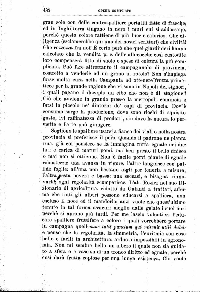 gran sole con delle controspalliere portatili fatte di frasche; ed in Inghilterra tingopo in nero i muri cui si addossalo, perché questo colore rattieue di più luce e calorico. Ohe diligenza (esclamerebbe qui uno dei nostri scrittori) che civiltà! Ohe rozzezza fra noi! È certo però che quei giardinieri hanno calcolato che la vendita p. e. delle albicocche così custodite loro compenserà fitto di suolo e spese di coltura la più complicata. Può fare altrettanto il campagnuolo di provincia, costretto a venderle ad un grano al rotolo? Non s'impiega forse molta cura nella Campania ad ottenere'frutta prima-ticce per la grande ragione che vi sono in Napoli dei signori, i quali pagano il decuplo un cibo che non è di stagione? Ciò che avviene in grande presso la metropoli comincia a farsi in piccolo ne' dintorni de' capi di provincia. Dov'è consumo sorge la produzione; dove sono ricchi di squisito gusto, ivi raffinatezza di prodotti, sin dove la natura lo permette e l'arte può giungere.