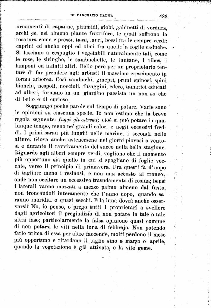 Soggiungo poche parole sul tempo di potare. Varie sono le opinioni su ciascuna specie. Io non estimo che la breve regola seguente: fuggì gli estremi; cioè si può potare in qualunque tempo, meno ne' grandi calori e negli eccessivi freddi. I primi saran più lunghi nelle marine, i secondi nelle alture. Giova anche as tenersene nei giorni piovosi o ventosi e durante il ravvivamento del succo nella bella stagione. Eiguardo agli alberi sempre verdi, vogliono che il momento più opportuno sia quello in cui si spogliano di foglie vecchie, verso il principio di primavera. Fra questi fa d'uopo di tagliare meno i resinosi, e non mai accosto al tronco, onde non eccitare un eccessivo trasudamento di resina; bensì i laterali vanno mozzati a mezzo palmo almeno dal fusto, non troncandoli interamente che l'anno dopo, quando saranno inariditi o quasi secchi. E la luna dovrà anche osservarsi? No, io penso, e prego tutti i proprietarì a svellere dagli agricoltori il pregiudizio di non potare in tale o tale altra fase; particolarmente la falsa opinione quasi comune di non potarsi le viti nella luna di febbrajo. Non potendo farlo prima di essa per altre faccende, molti perdono il mese più opportuno e ritardano il taglio sino a marzo o aprile, quando la vegetazione è già attivata, e la vite geme,