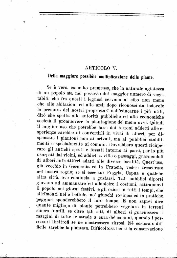 Se è vero, come ho premesso, che la naturale agiatezza di un popolo sta nel possesso del maggior numero di vege-tabili: che fra questi i legnosi servono al cibo non meno che alle abitazioni ed alle arti; dopo riconosciuta lodevole la premura dei nostri proprietarì nell'educarne i più utili, dirò che spetta alle autorità pubbliche ed alle economiche società il promuovere la piantagione de' meno ovvi. Quindi il miglior uso che potrebbe farsi dei terreni addetti alle e-sperienze sarebbe di convertirli in vivai di alberi, per dispensare i piantoni non ai privati, ma ai pubblici stabilimenti e specialmente ai comuni. Dovrebbero questi ricuperare gli antichi spalti e fossati intorno ai paesi, per lo più usurpati dai vicini, ed addirli a ville o passaggi, guarnendoli di alberi ^infruttiferi adatti alle diverse località. Quest'uso, già vecchio in Germania ed in Francia, vedesi trascurato nel nostro regno; se si eccettui Foggia, Oapua e qualche altra città, ove comincia a gustarsi. Tali pubblici diporti giovano ad ammansare ed addolcire i costumi, attirandovi il popolo nei giorni festivi, e gli oziosi in tutti i tempi, che altrimenti nelle bettole, ne' giucchi rovinosi ed in pratiche peggiori spenderebbero il loro tempo. E non saprei dire quante migliaja di piante potrebbero vegetare in terreni sinora inutili, se oltre tali siti, di alberi si guarnissero i margini di tutte le strade a cura de' comuni^ quando i possessori limitrofi se ne mostrassero ritrosi. Né costosa o dif ficile sarebbe la piantata, Difficoltosa bensì la conservazione