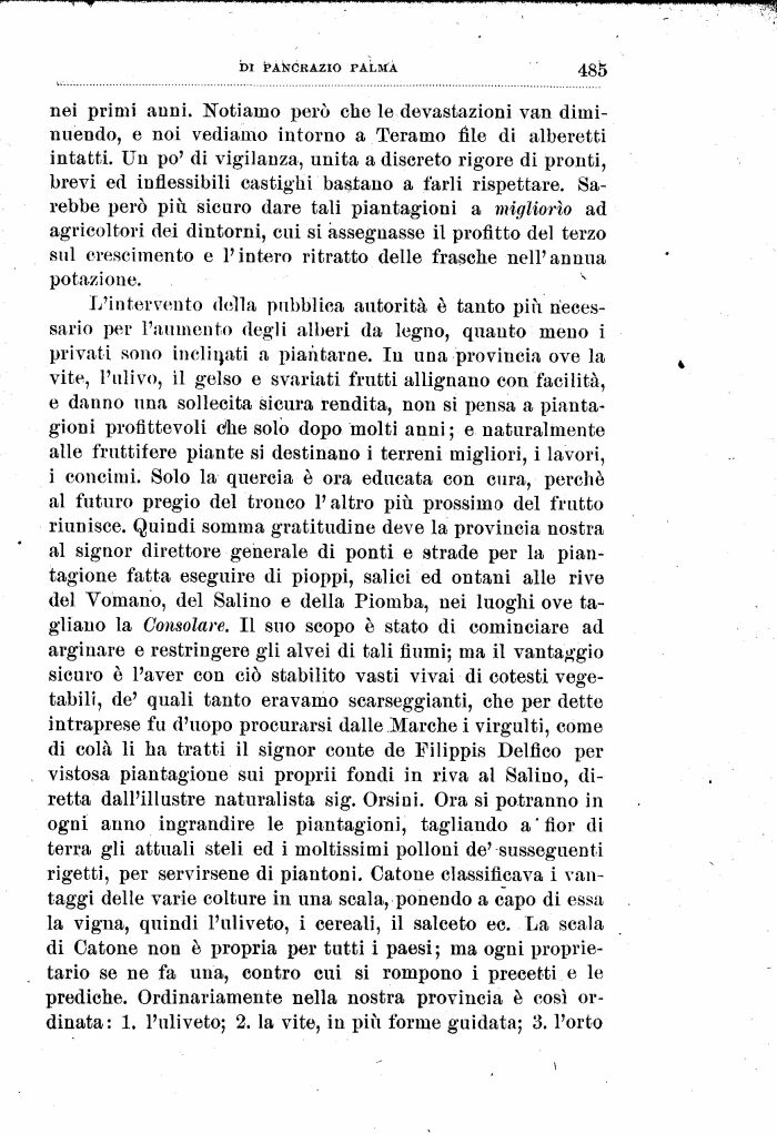L'intervento della pubblica autorità è tanto più necessario per l'aumento degli alberi da legno, quanto meno i privati sono inclinati a piantarne. In una provincia ove la vite, l'ulivo, il gelso e svariati frutti allignano con facilità, e danno una sollecita sicura rendita, non si pensa a piantagioni profittevoli e/he solo dopo molti anni ; e naturalmente alle fruttifere piante si destinano i terreni migliori, i lavori, i concimi. Solo la quercia è ora educata con cura, perché al futuro pregio del tronco l'altro più prossimo del frutto riunisce. Quindi somma gratitudine deve la provincia nostra al signor direttore generale di ponti e strade per la piantagione fatta eseguire di pioppi, salici ed ontani alle rive del Vernano, del Salino e della Piomba, nei luoghi ove tagliano la Consolare. Il suo scopo è stato di cominciare ad arginare e restringere gli alvei di tali fiumi; ma il vantaggio sicuro è l'aver con ciò stabilito vasti vivai di cotesti vege-tabili, de' quali tanto eravamo scarseggianti, che per dette intraprese fu d'uopo procurarsi dalle Marche i virgulti, come di colà li ha tratti il signor conte de Filippis Delfico per vistosa piantagione sui proprii fondi in riva al Salino, diretta dall'illustre naturalista sig. Orsini. Ora si potranno in ogni anno ingrandire le piantagioni, tagliando a'fior di terra gli attuali steli ed i moltissimi polloni de' susseguenti rigetti, per servirsene di piantoni. Catone classificava i vantaggi delle varie colture in una scala, ponendo a capo di essa la vigna, quindi l'uliveto, i cereali, il salceto ec. La scala di Catone non è propria per tutti i paesi; ma ogni proprietario se ne fa una, contro cui si rompono i precetti e le prediche. Ordinariamente nella nostra provincia è così ordinata: 1. l'uliveto; 2. la vite, in più forme guidata; 3. l'orto