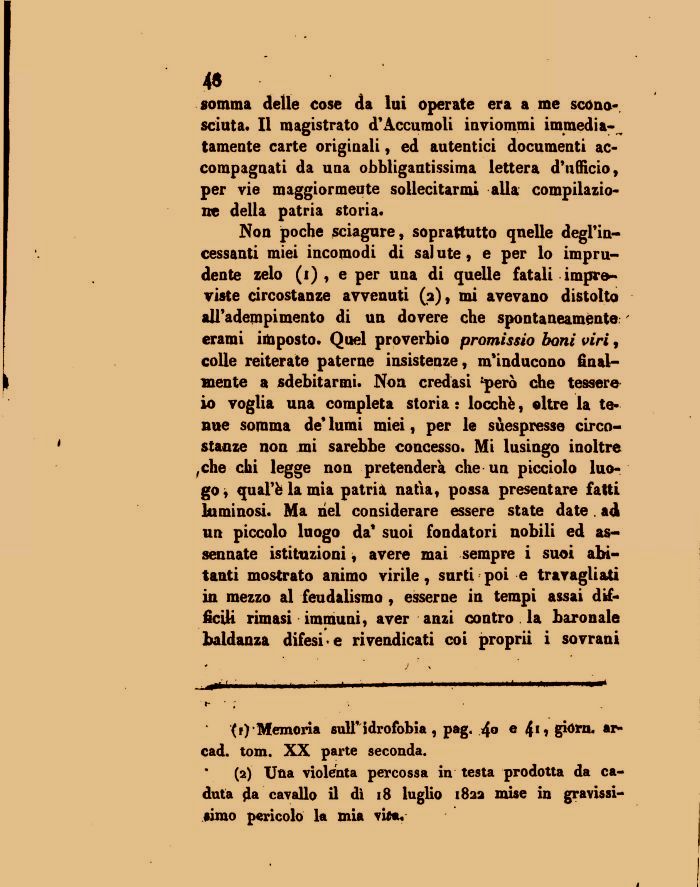 Non poche sciagure, soprattutto quelle degl'incessanti miei incomodi di sai ute, e per lo imprudente zelo (i) , e per una di quelle fatali impreviste circostanze avvenuti (a), mi avevano distolto all'adempimento di un dovere che spontaneamente: ' erami imposto. Quel proverbio promissio boni viri, colle reiterate paterne insistenze, m'inducono finalmente a sdebitarmi. Non credasi 'però che tessere io voglia una completa storia : locchfe, oltre la tenue somma de* lumi miei, per le sùespresse circostanze non mi sarebbe concesso. Mi lusingo inoltre ,che chi legge non pretenderà che un picciolo luogo , qual'fe la mia patria natia, possa presentare fatti luminosi. Ma nel considerare essere state date . ad un piccolo luogo da' suoi fondatori nobili ed assennate istituzioni, avere mai sempre i suoi abitanti mostrato animo virile, surti poi e travagliati in mezzo al feudalismo, esserne in tempi assai difficili rimasi immuni, aver anzi contro . la baronale baldanza difesi e rivendicati coi proprii i sovrani