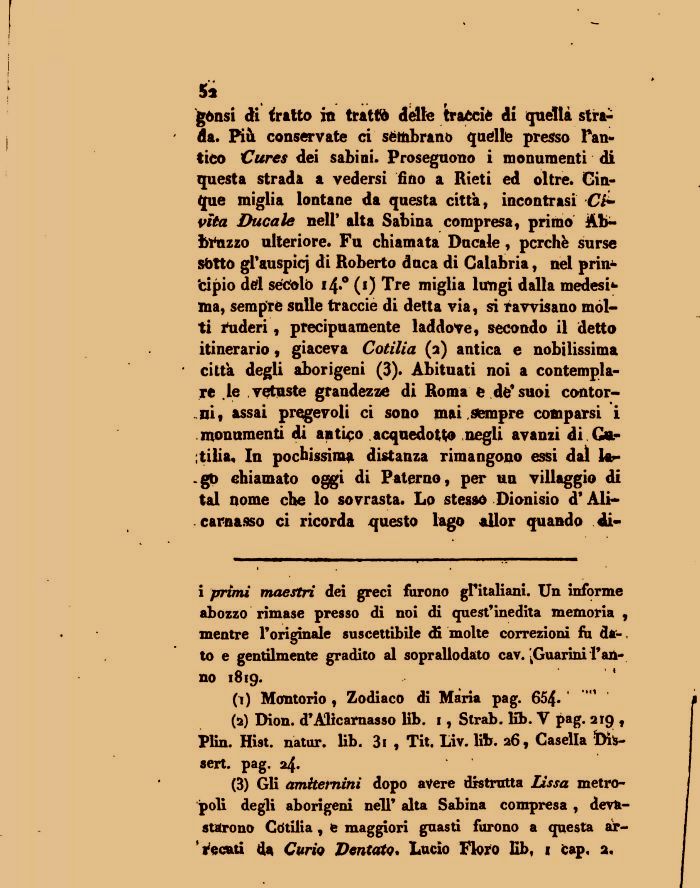 gònsi di tratto io trattò delle trtócie di quella strada. Più conservate ci sembrano quelle presso Pan-tico Cures dei sabini. Proseguono i monumenti di questa strada a vedersi fino a Rieti ed oltre. Cinque miglia lontane da questa citta, incontrasi Civita Ducale nell* alta Sabina compresa, primo Ab-iftuzzo ulteriore. Fu chiamata Ducale, perchè surse sótto gl'auspicj di Roberto duca di Calabria, nel principio dei secolo 14® (1) Tre miglia lungi dalla medesi*-ma, sempre sulle traccie di detta via, si ravvisano mólti ruderi, precipuamente laddove, secondo il detto itinerario, giaceva Cotilia (a) antica e nobilissima citta degli aborigeni (3). Abituati noi a contemplare .le vetuste grandezze di Roma e de'suoi contorni, assai pregevoli ci sono mai sempre comparsi i monumenti di antico acquedotto negli avanzi diGa-;tilia, In pochissima distanza rimangono essi dal kr -g chiamato oggi di Paterno, per un villaggio di tal nome che lo sovrasta. Lo stesse Dionisio d'Ali-carnasso ci ricorda questo lago allor quando