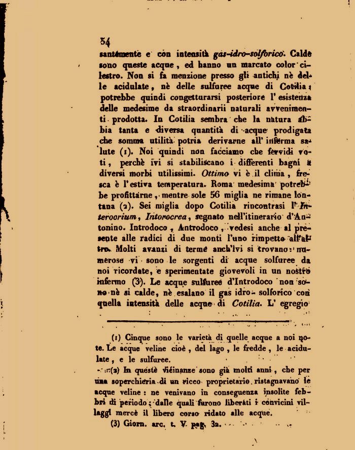 santémente e con intensità gas-idro-solforico. Calde sono queste acque, ed hanno un marcato color'cU lestro. Non si £a menzione presso gli antichi nfe del* le acidulate, nè delle sulfuree acque di Cotilia * potrebbe quindi congetturarsi posteriore l* esistenza delle medesime da straordinarii naturali avvenimenti prodotta. In Cotilia sembra che la natura bia tanta e -diversa quantità di -acque prodigata che somma utilità, potria derivarne all' inferma sa-* Iute (i). Noi quindi non facciamo che fèrvidi voti , perchè ivi si stabiliscano i differenti bagni ft diversi morbi utilissimi. Ottimo vi è,il clima, fresca è l'estiva temperatura» Roma medesima' potrete be profittarne ,< mentre sole 56 miglia ne rimane lontana (?). Sei miglia dopo Cotilia rincontrasi F /n-teroorium, Intonocrea, segnato nell'itinerario* d'Antonino. Introdoco t Antrodoco , -vedesi anche al presente alle radici di due monii l'uno rim petto alPat* trrv Molti avanzi di termé anch'ivi si trovano :1 numerose vi - sono le sorgenti di acque solfuree da noi ricordate, e sperimentate giovevoli in un noitrb infermo (3). Le acque sulfuree d'Introdoco ' non 'so*-no-nfc si calde, nè,esalano il gas idro- solforico con quella intensità delle acque di Cotilia. L' egregio