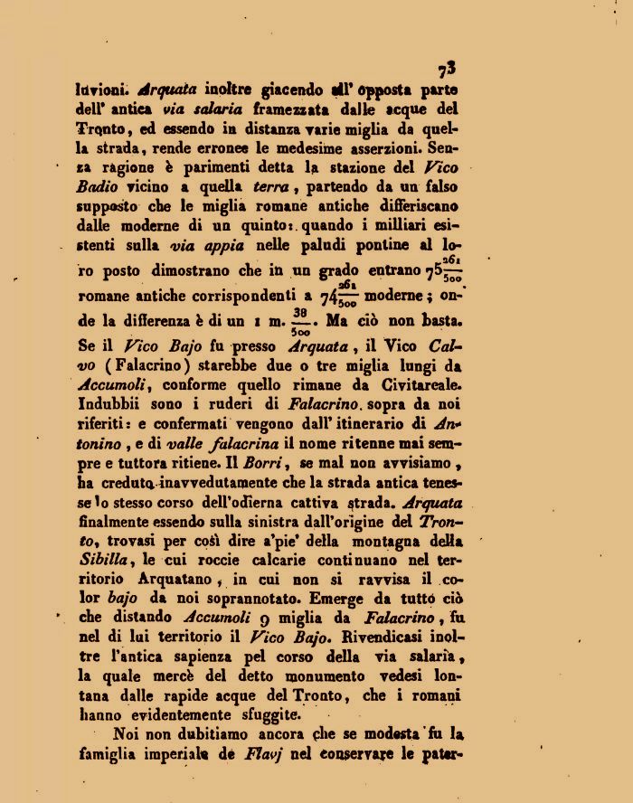 IdTioai. Arquata inoltre giacendo all' opposta parte deli* antiea via salaria framezzata dalle acque del Tronto, ed essendo in distanza varie miglia da quella strada, rende erronee le medesime asserzioni. Senza ragione h parimenti detta la stazione del Vico Badio vicino a quella terra, partendo da un falso supposto cbe le miglia romane antiche differiscano dalle moderne di un quinto:, quando i milliari esistenti sulla via appia nelle paludi pontine al loro posto dimostrano che in un grado entrano romane antiche corrispondenti a 74^ moderne ; on-*