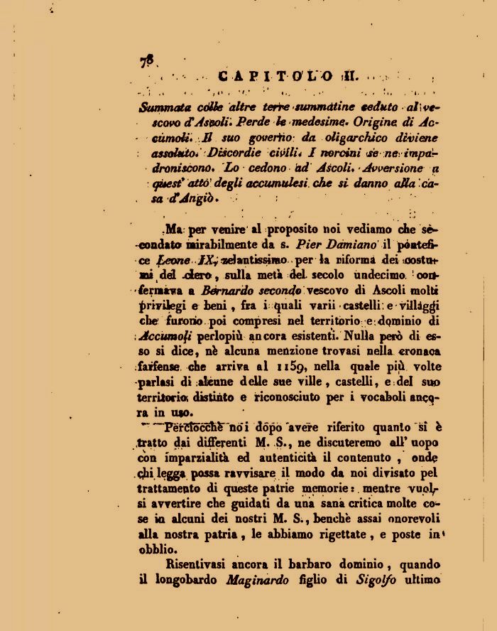 .Ma per venire' al proposito noi vediamo che sè--condato mirabilmente da s. Pier Damiano il pontefice Leone tantissimo per la riforma dei ìgost ut-mi del .clero, sulla metà del. secolo undecimo. oou-¦ fermava a Bernardo secondo vescovo di Ascoli molti privilegi e beni , fra i quali varii castelli: e villàggi che furono, poi compresi nel territorio e. dominio di ; Accumoli perlopiù ancora esistenti. Nulla però di esso si dice, nfe alcuna menzione trovasi nella cronaca farfense che arriva al nSj), nella quale più volte -parlasi di : alcune delle sue ville, castelli, e del suo territorio; distinto e riconosciuto per i vocaboli ancora in uso.